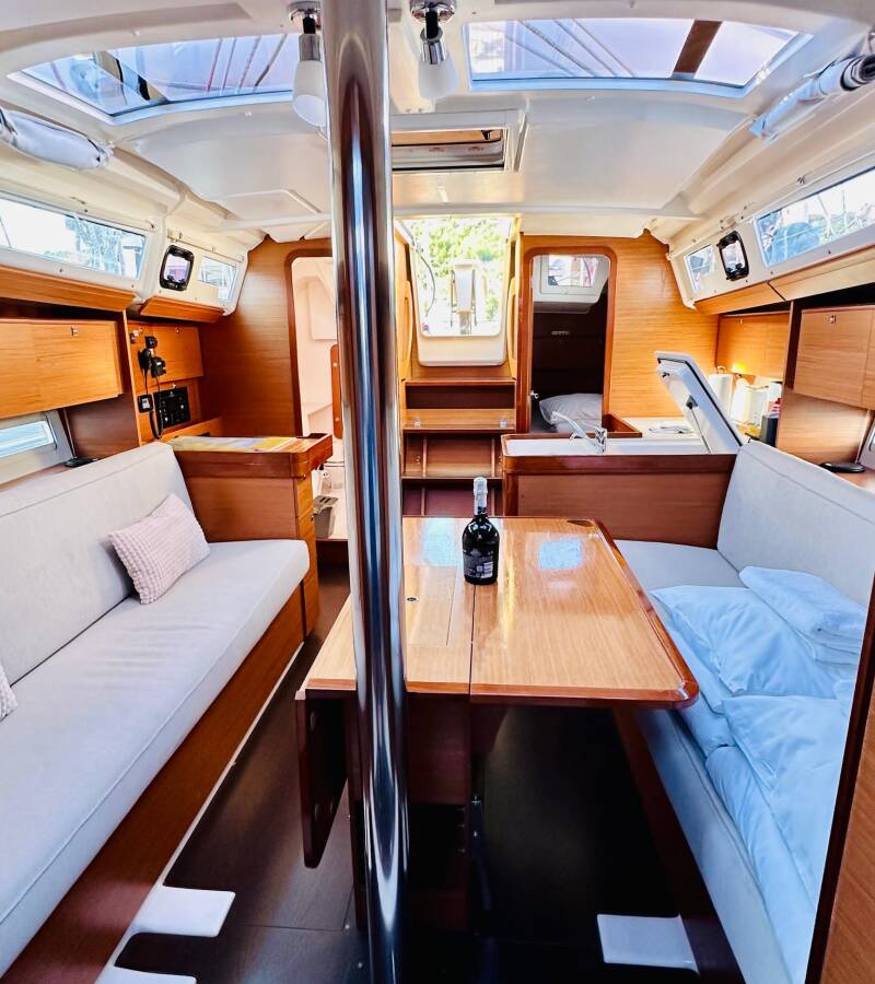 The Dufour 360 GL „Alpha“ offers special comfort with the following equipment features: Bow thruster, Air Conditioning, Cockpit cushions, Bathing platform, Cockpit grill.