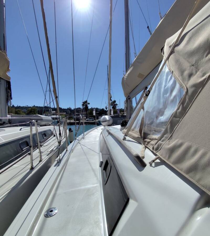 The Dufour 390 GL „COILA“ is equipped with a mainsail and a genoa as well as a Bimini top, Autopilot, Sprayhood, GPS chart plotter - cockpit.