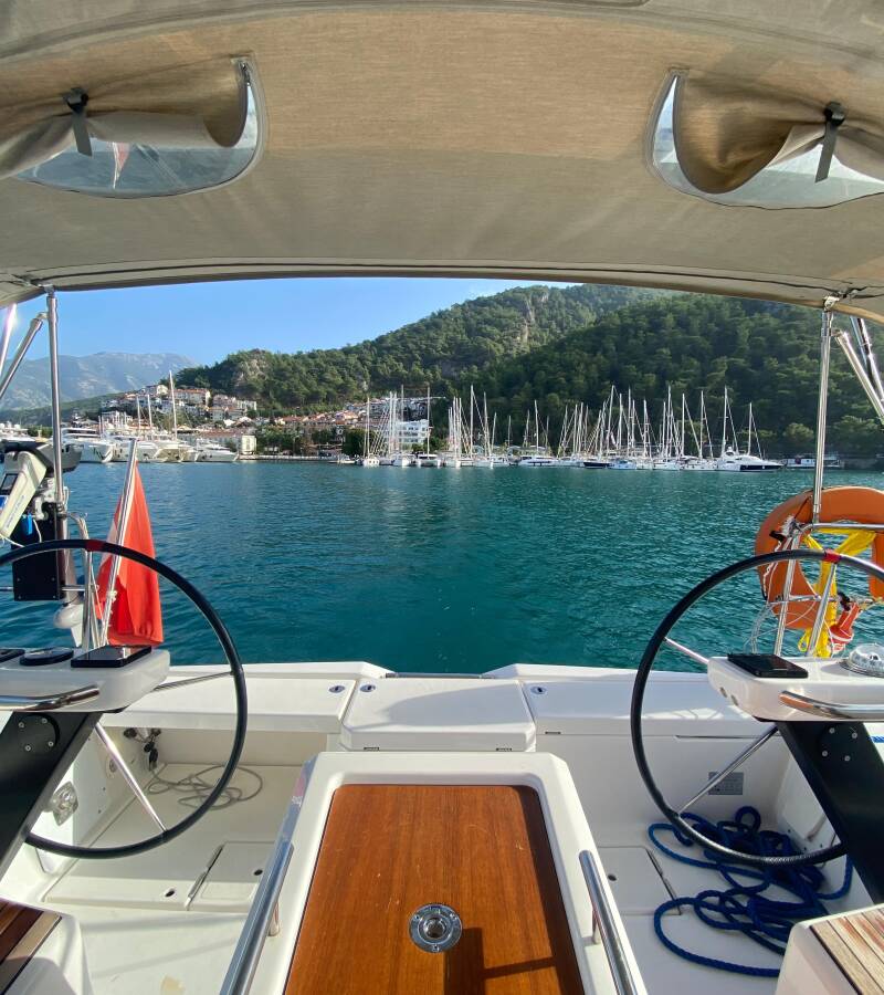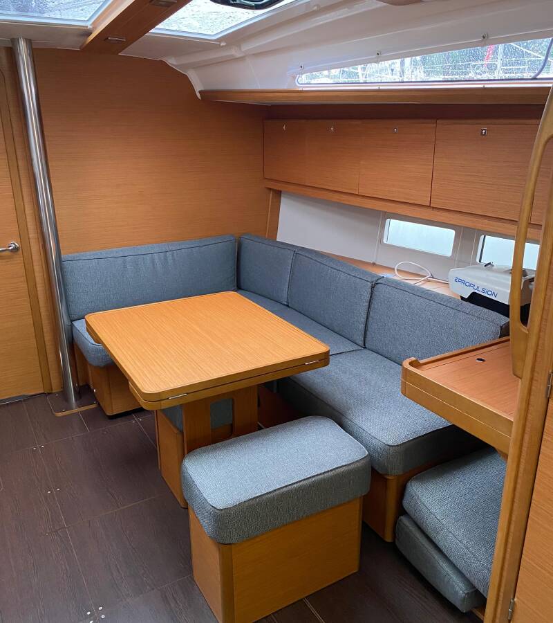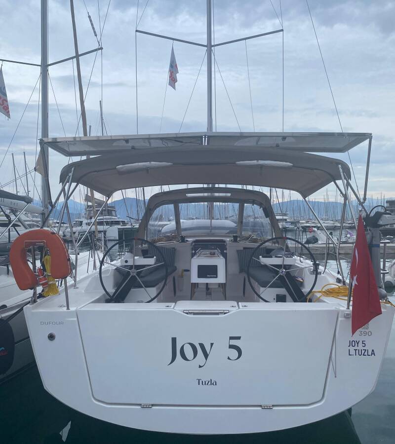 The Dufour 390 „Joy 5“ is equipped with a mainsail and a genoa as well as a Bimini top, Autopilot, Sprayhood, Heating, GPS chart plotter - cockpit.