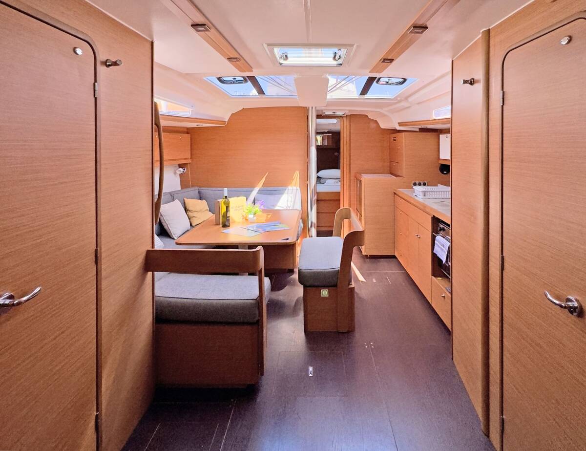 The Dufour 430 „First Love“ offers special comfort with the following equipment features: Bow thruster, Cockpit cushions, Electric toilet, Solar panels.