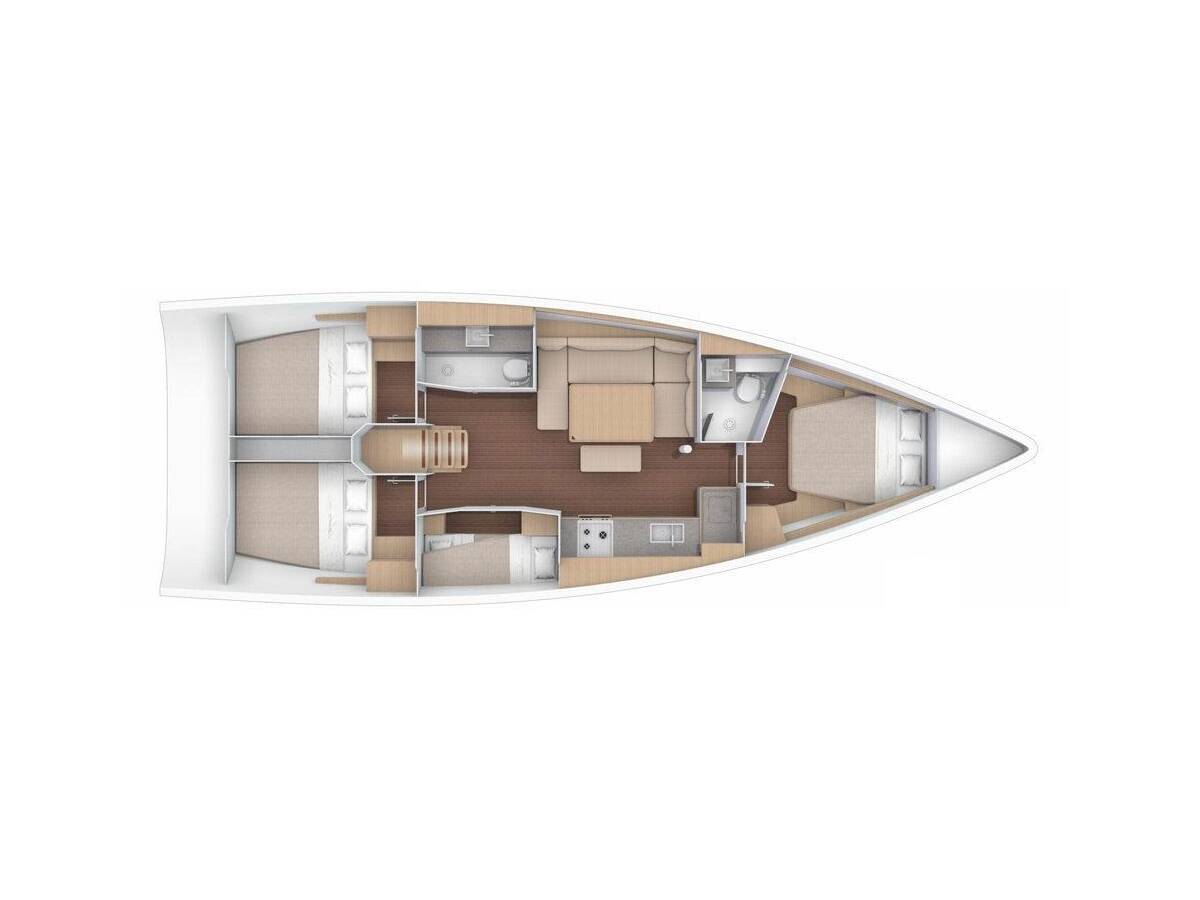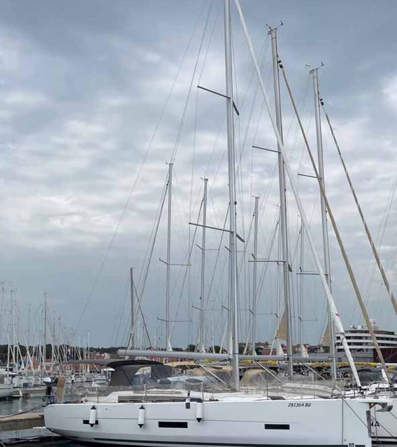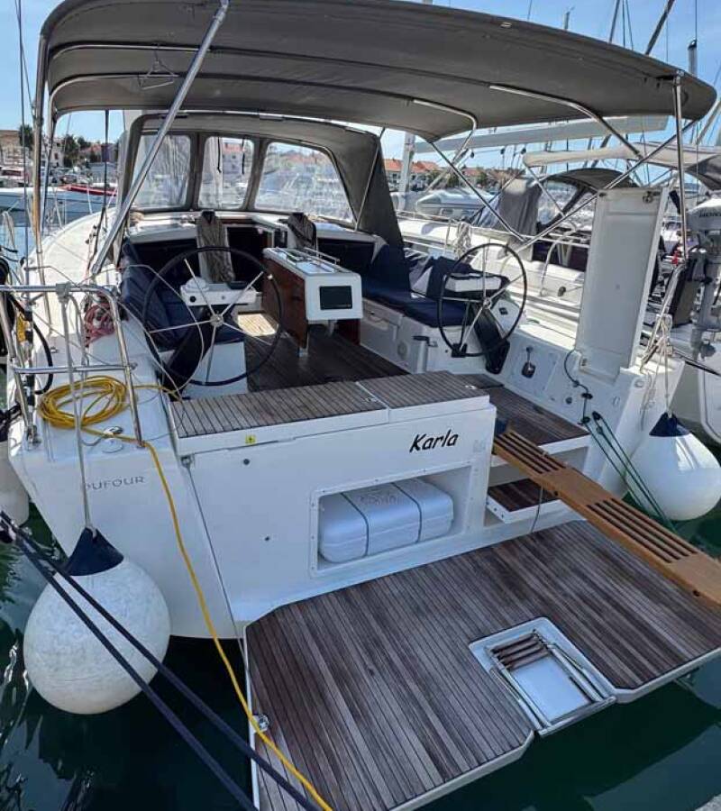The Dufour 430 „Karla“ is equipped with a mainsail and a genoa as well as a Bimini top, Autopilot, Sprayhood, Heating, Teak cockpit, GPS chart plotter - cockpit.