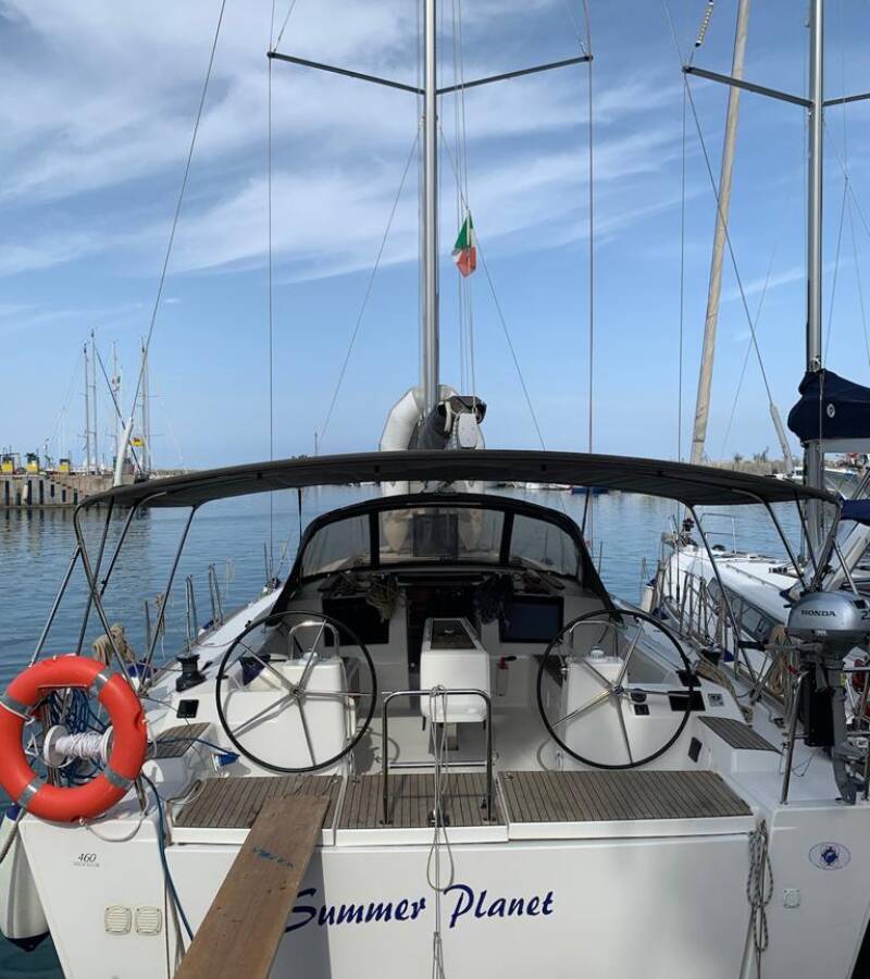 The Dufour 460 GL „Summer Planet“ is equipped with a mainsail and a genoa as well as a Bimini top, Autopilot, Sprayhood.