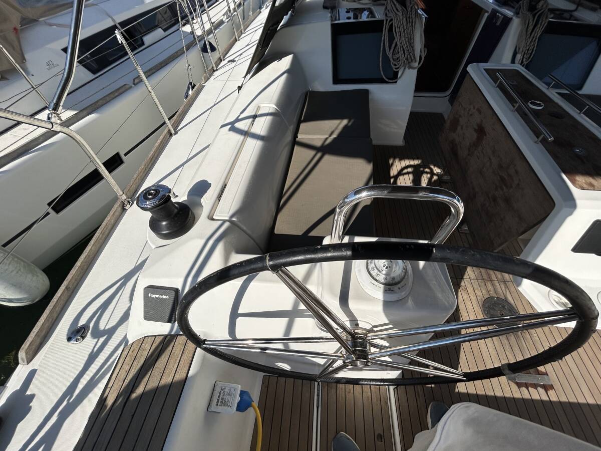 The Dufour 460 GL „Tango I“ is equipped with a mainsail and a genoa as well as a Bimini top, Autopilot, Sprayhood, Teak cockpit.
