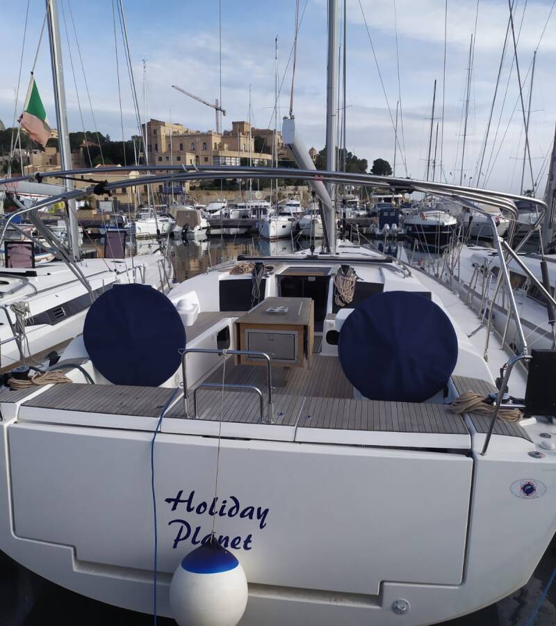 The Dufour 520 GL „Holiday Planet“ is equipped with a mainsail and a genoa as well as a Bimini top, Autopilot, Sprayhood.
