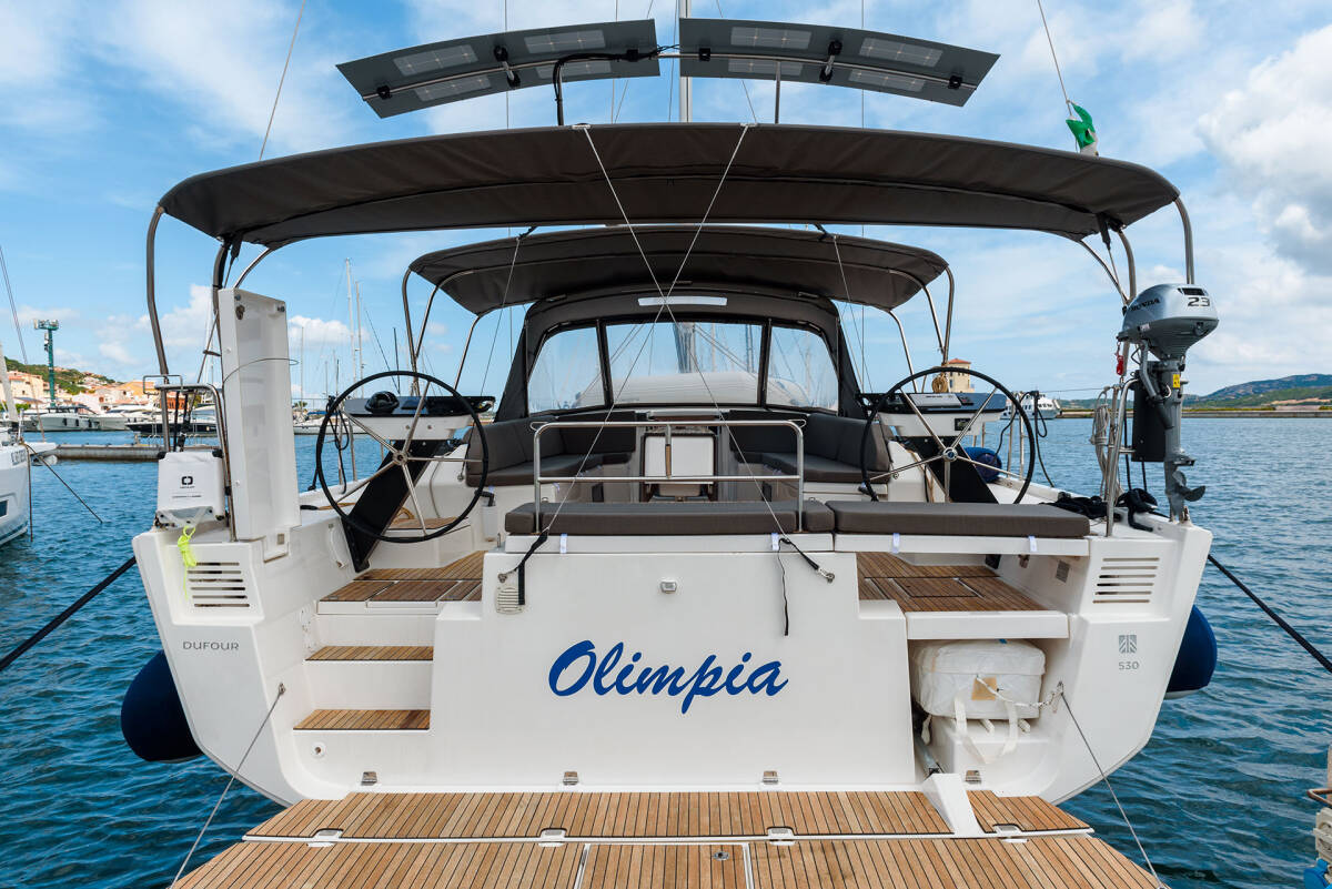 The Dufour 530 „Olimpia“ offers special comfort with the following equipment features: Bow thruster, Generator, Air Conditioning, Cockpit cushions, Bathing platform, Inverter, Electric toilet, Solar panels, Cockpit grill.