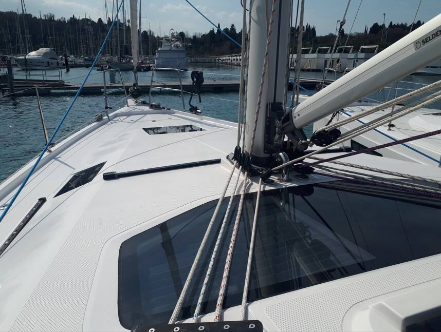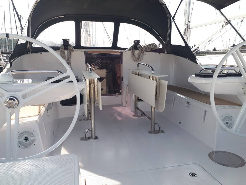 The Elan Impression 45 (ex. 43) „Alfa One“ is equipped with a mainsail and a genoa as well as a Radar, Bimini top, Autopilot, Sprayhood, Heating, GPS chart plotter - cockpit.
