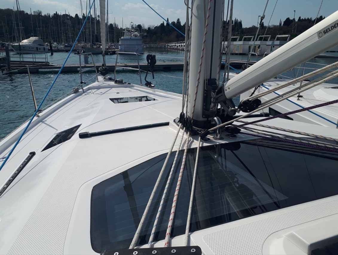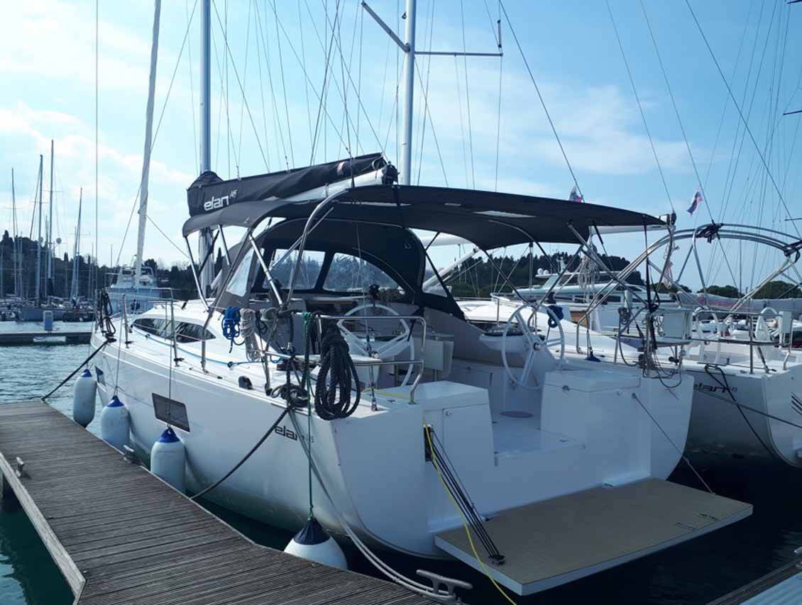 The Elan Impression 45 (ex. 43) „One for all“ is equipped with a mainsail and a genoa as well as a Radar, Bimini top, Autopilot, Sprayhood, Heating, GPS chart plotter - cockpit.