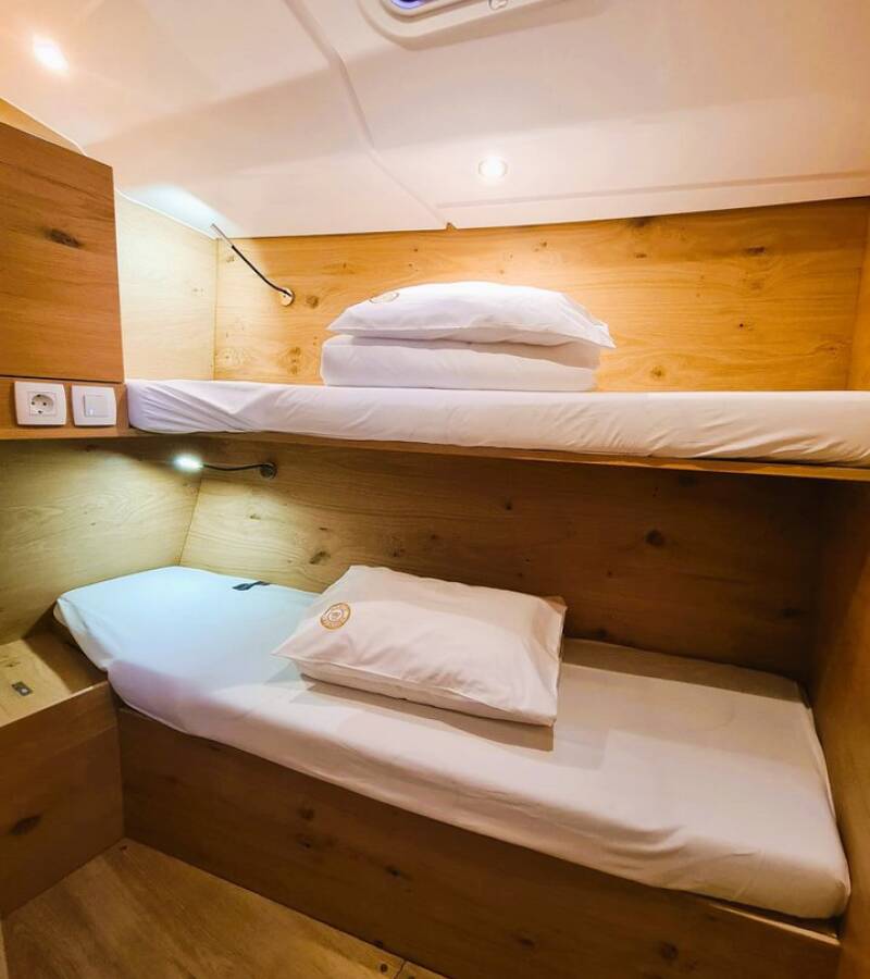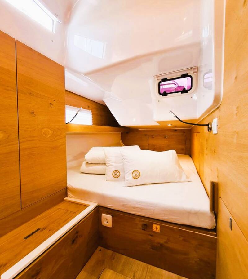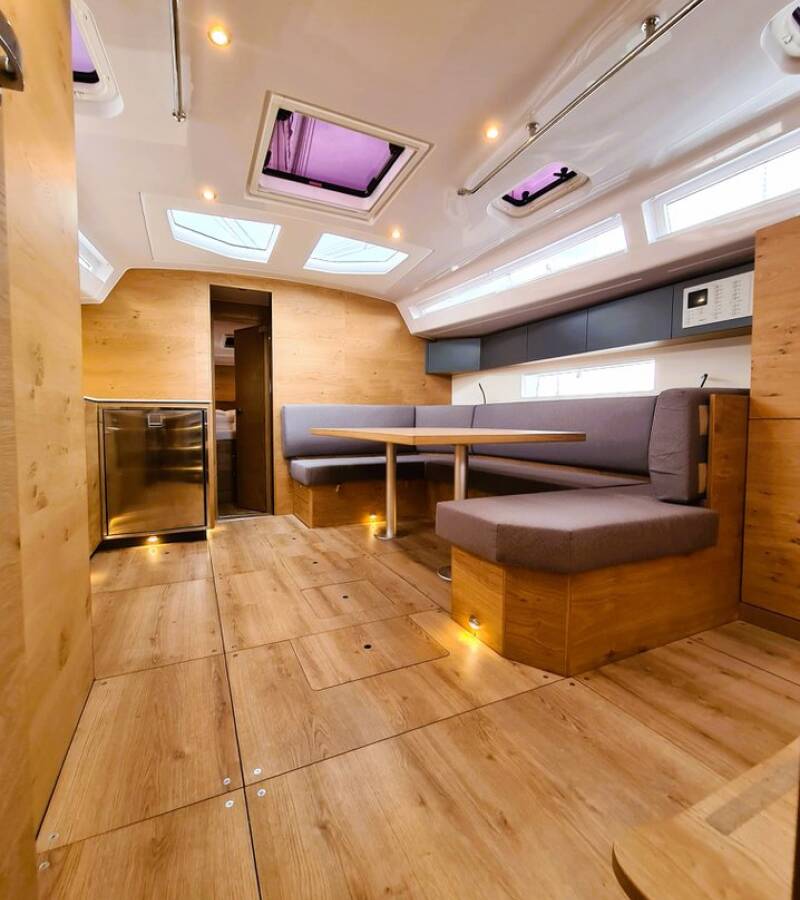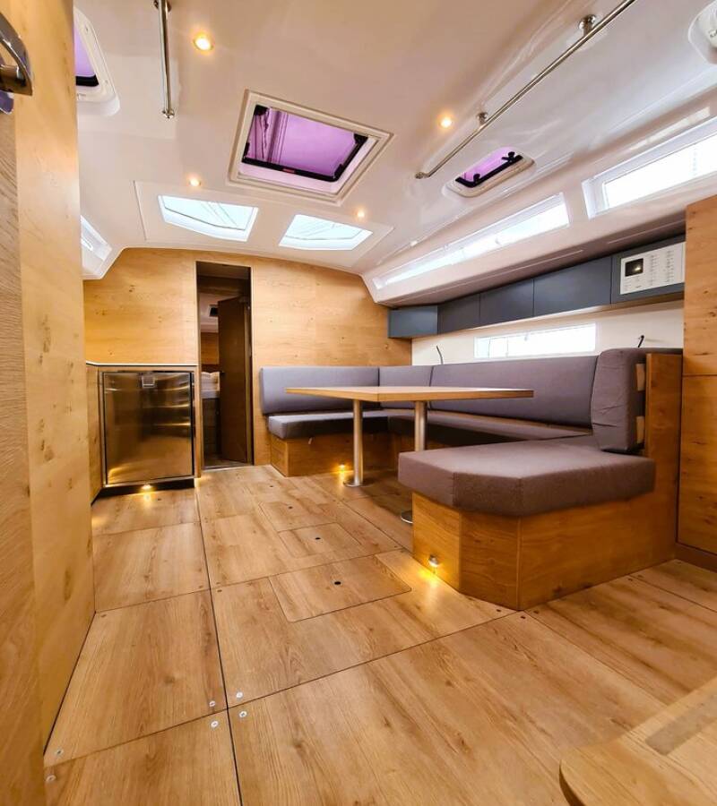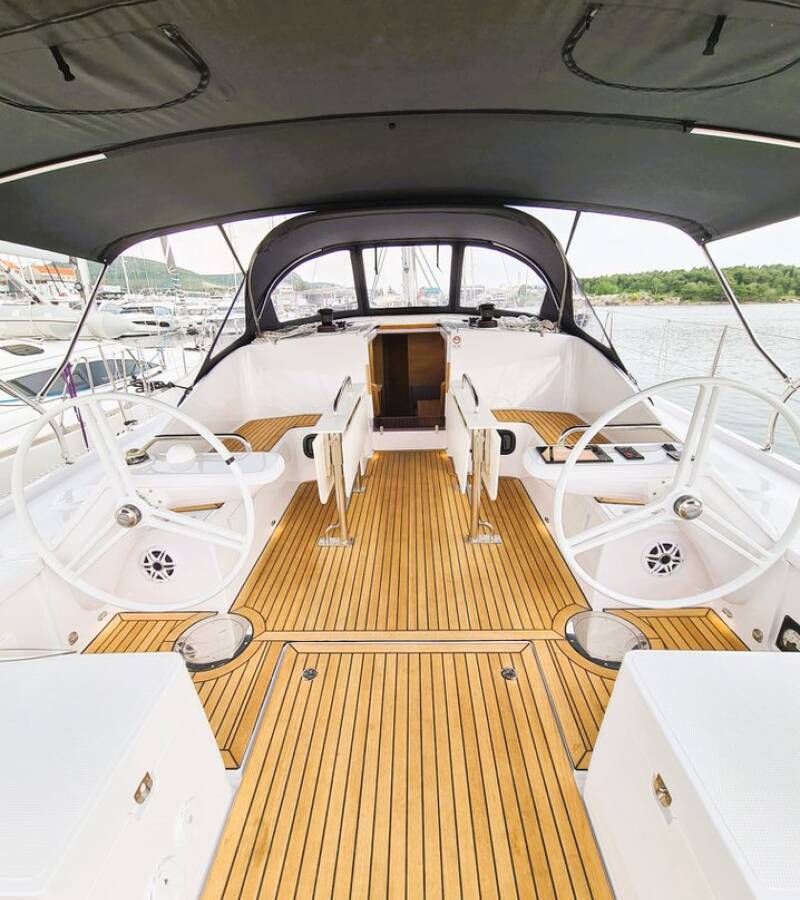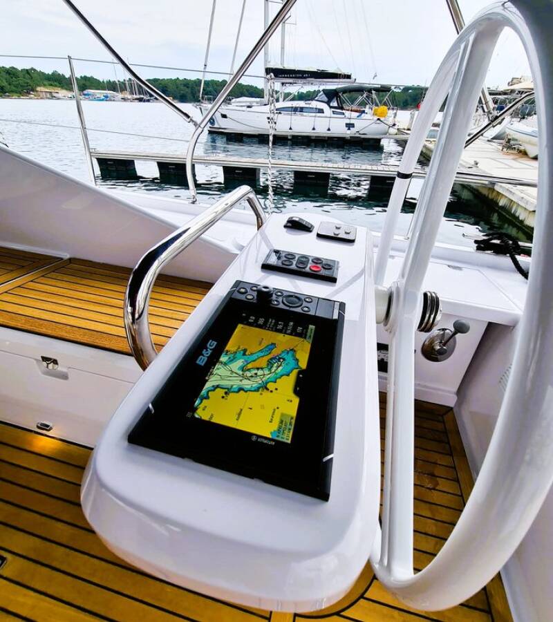 The Elan Impression 45 „Hangover“ is equipped with a mainsail and a genoa as well as a Bimini top, Autopilot, Sprayhood, Heating, Teak cockpit, GPS chart plotter - cockpit.