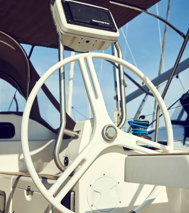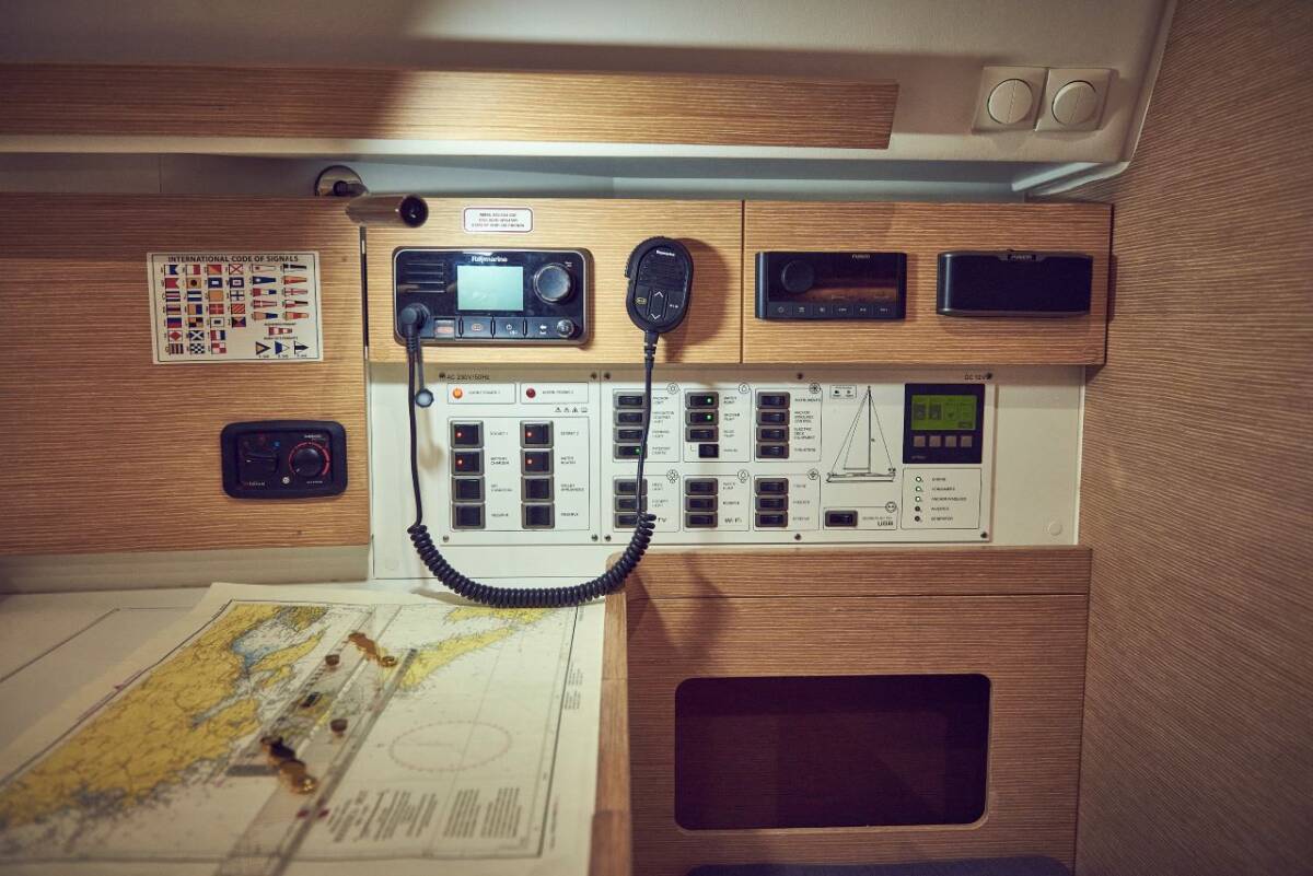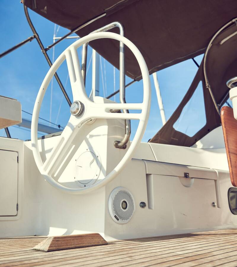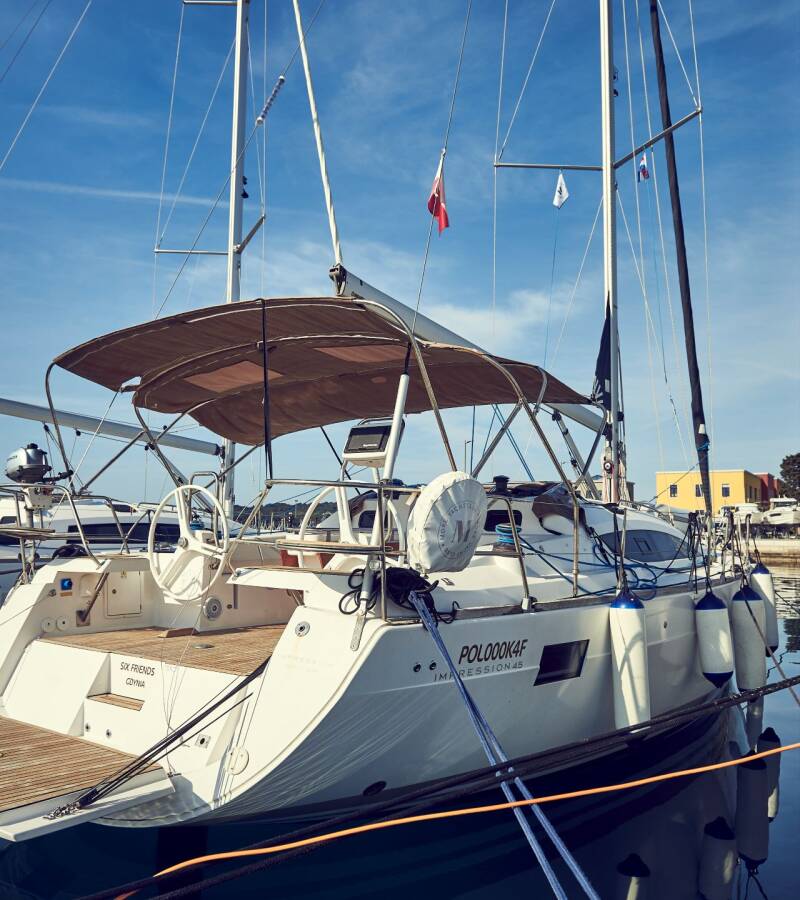 The Elan Impression 45 „Six Friends“ is equipped with a mainsail and a genoa as well as a Bimini top, Autopilot, Sprayhood, Heating, Teak cockpit, GPS chart plotter - cockpit.
