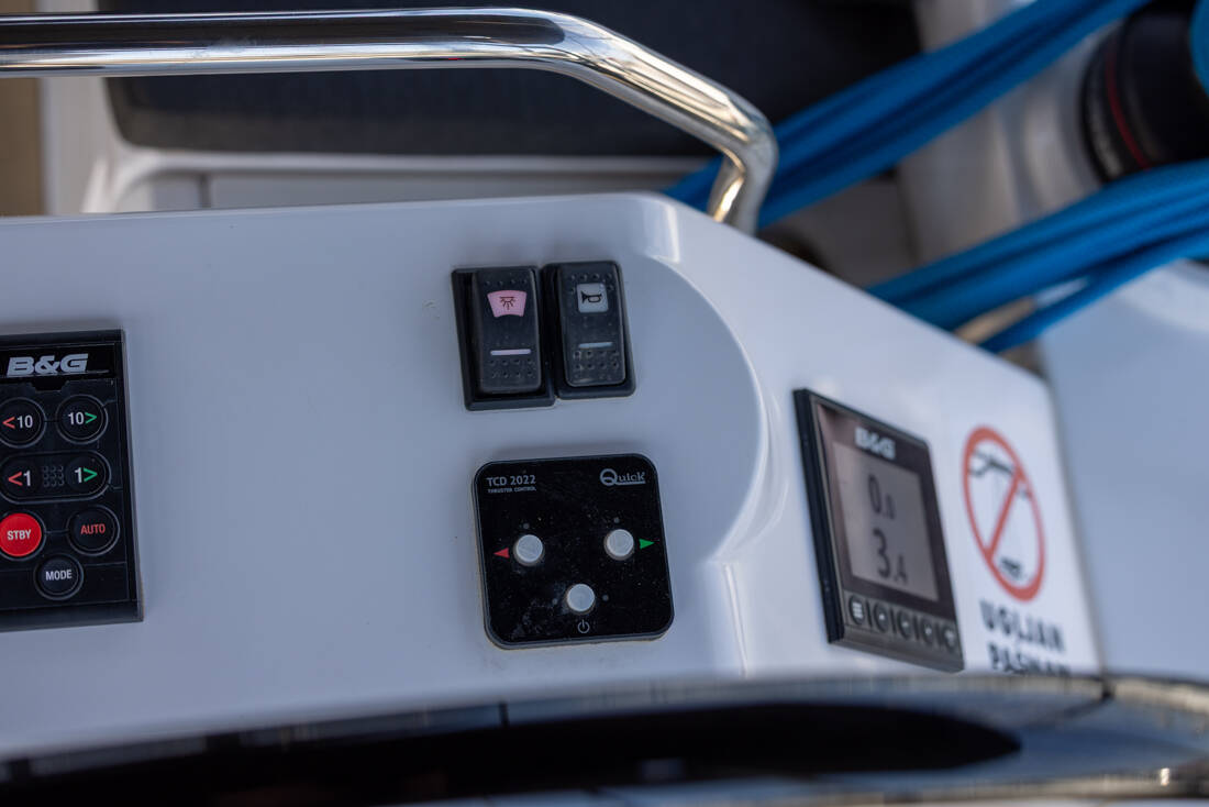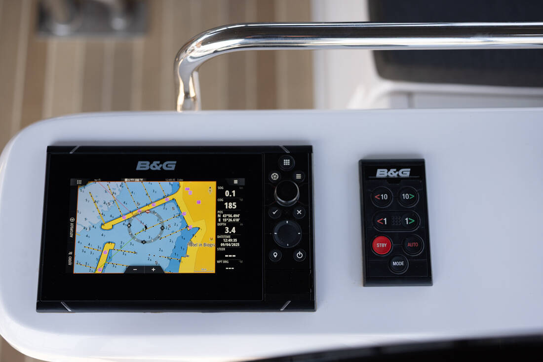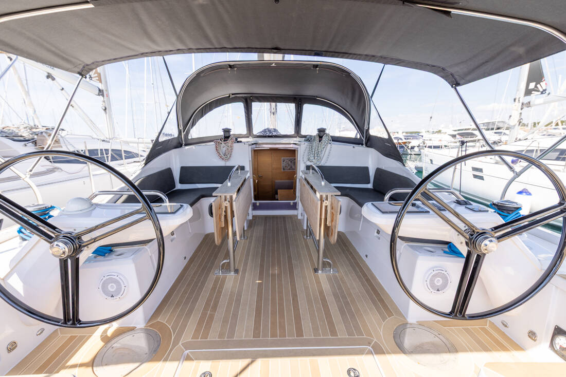 The Elan Impression 45 „Stargazer“ is equipped with a mainsail and a genoa as well as a Radar, Bimini top, Autopilot, Sprayhood, Heating, Teak cockpit, GPS chart plotter - cockpit.