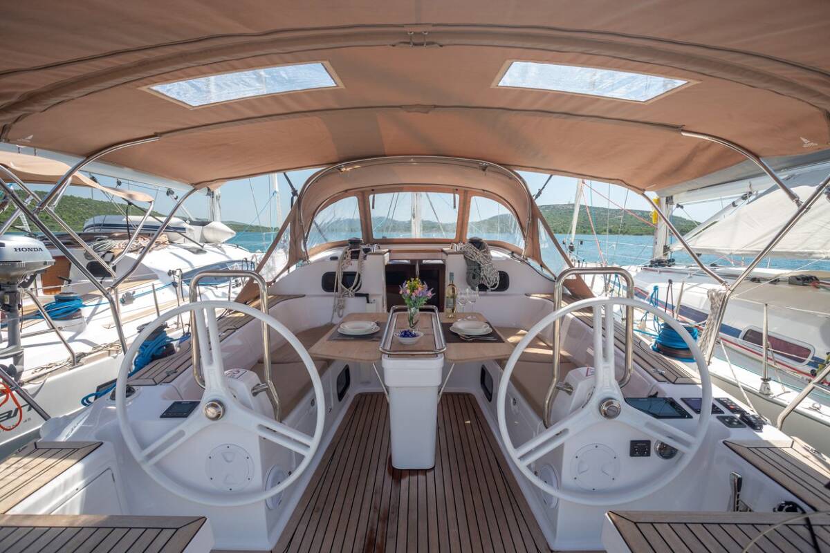 The Elan Impression 45 „Vera“ is equipped with a mainsail and a genoa as well as a Bimini top, Autopilot, Sprayhood, Heating, Teak cockpit, GPS chart plotter - cockpit.