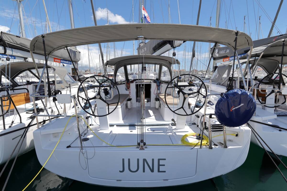 The First 36 „June“ is equipped with a mainsail and a genoa as well as a Bimini top, Autopilot, Sprayhood, Heating.