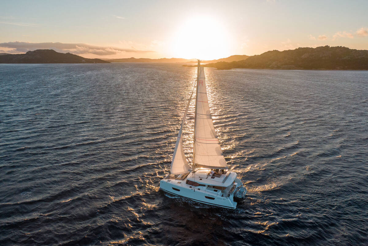 The Fountaine Pajot Astrea 42 „Agitation“ is equipped with a mainsail and a genoa as well as a Autopilot.
