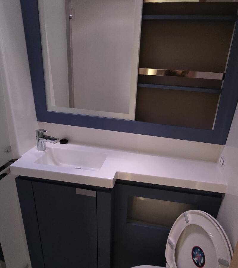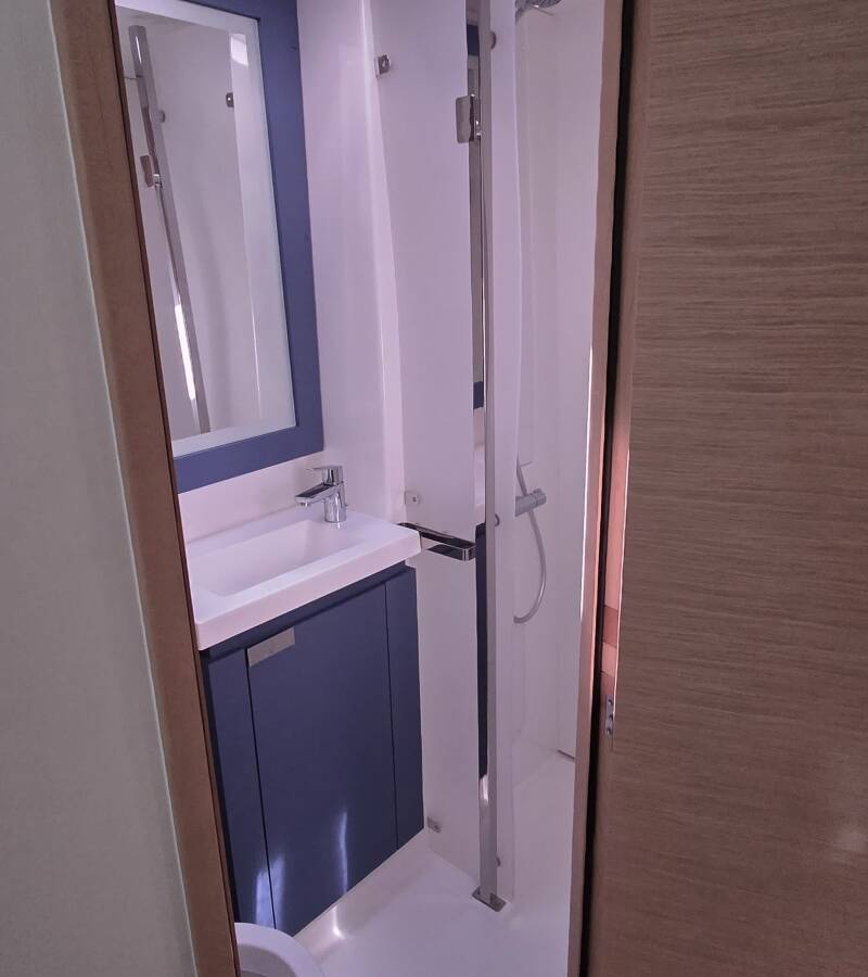 The Fountaine Pajot Elba 45 „Ruinart“ offers special comfort with the following equipment features: Generator, Air Conditioning, Inverter, Electric toilet.