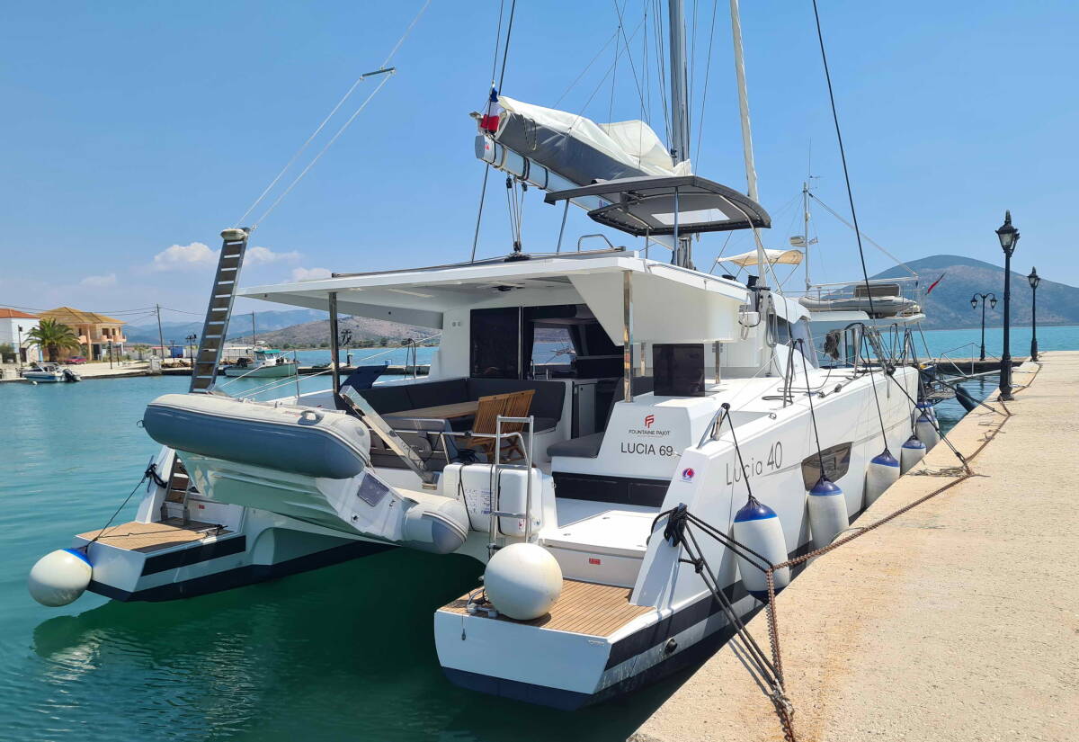 The Fountaine Pajot Lucia 40 „Lucia 69“ is equipped with a mainsail and a genoa as well as a Bimini top, Autopilot, Sprayhood.