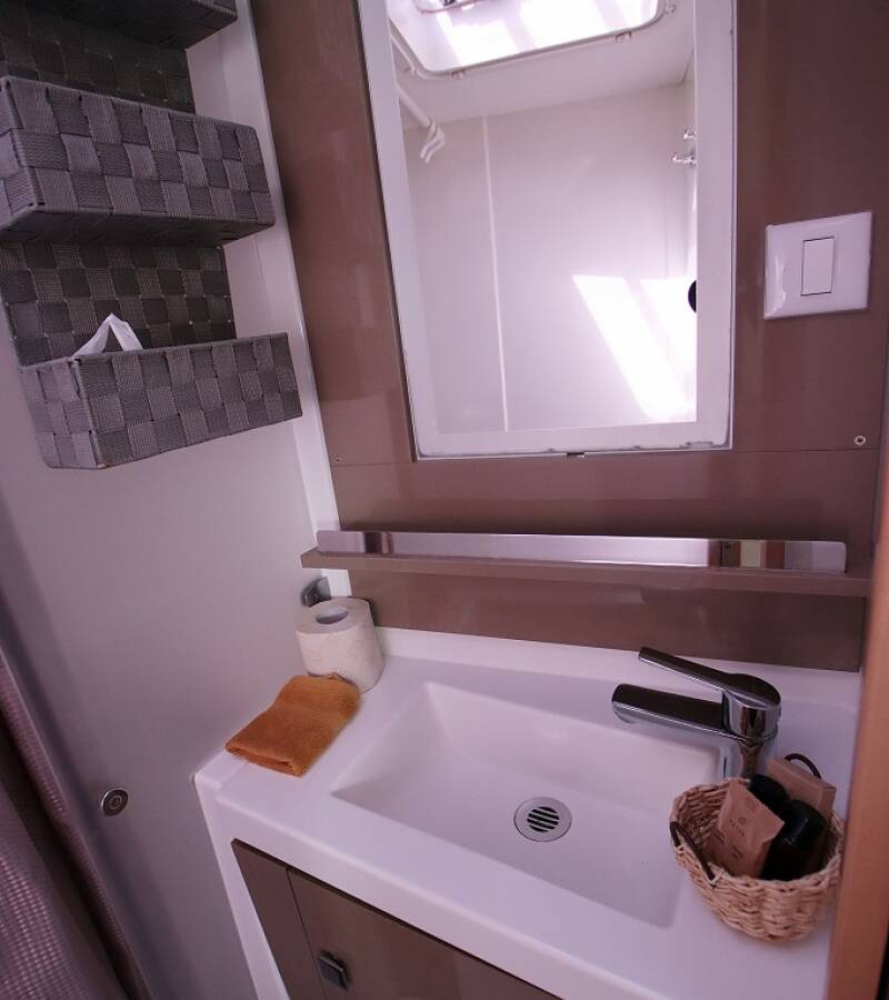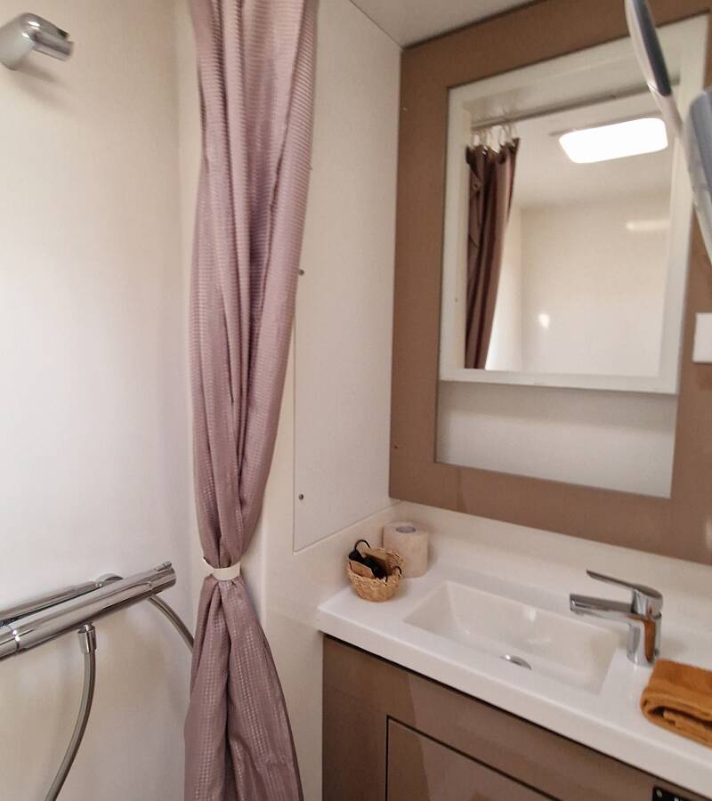 The Fountaine Pajot Saona 47 Quintet „Felicia“ offers special comfort with the following equipment features: Generator, Air Conditioning, Freezer, Cockpit cushions, Inverter, Electric toilet, Dishwasher, Solar panels.