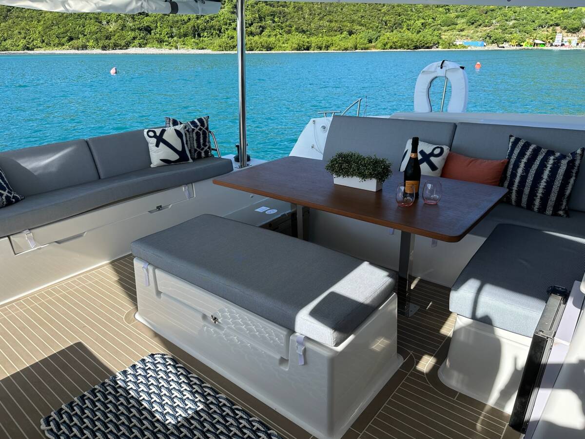 The Fountaine Pajot Tanna 47 „Feeling Knotty“ is equipped with a mainsail and a genoa as well as a Bimini top, Autopilot, Sprayhood, Teak cockpit, GPS chart plotter - cockpit.
