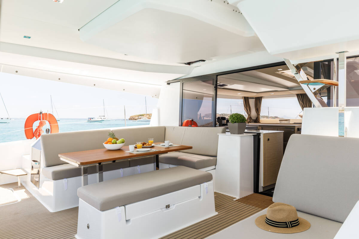 The Fountaine Pajot Tanna 47 „Nerida“ is equipped with a mainsail and a genoa as well as a Radar, Bimini top, Autopilot, Sprayhood, GPS chart plotter - cockpit.