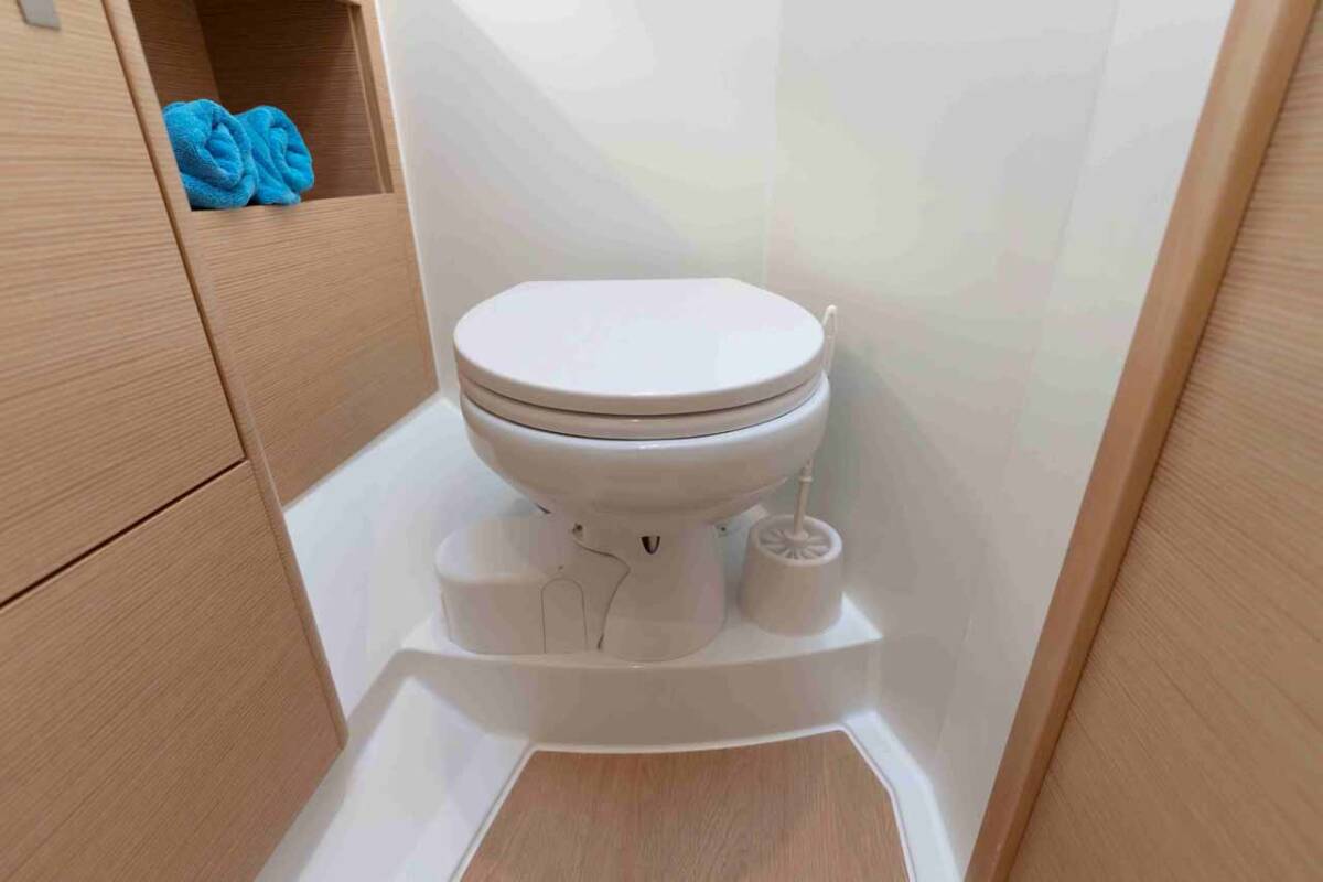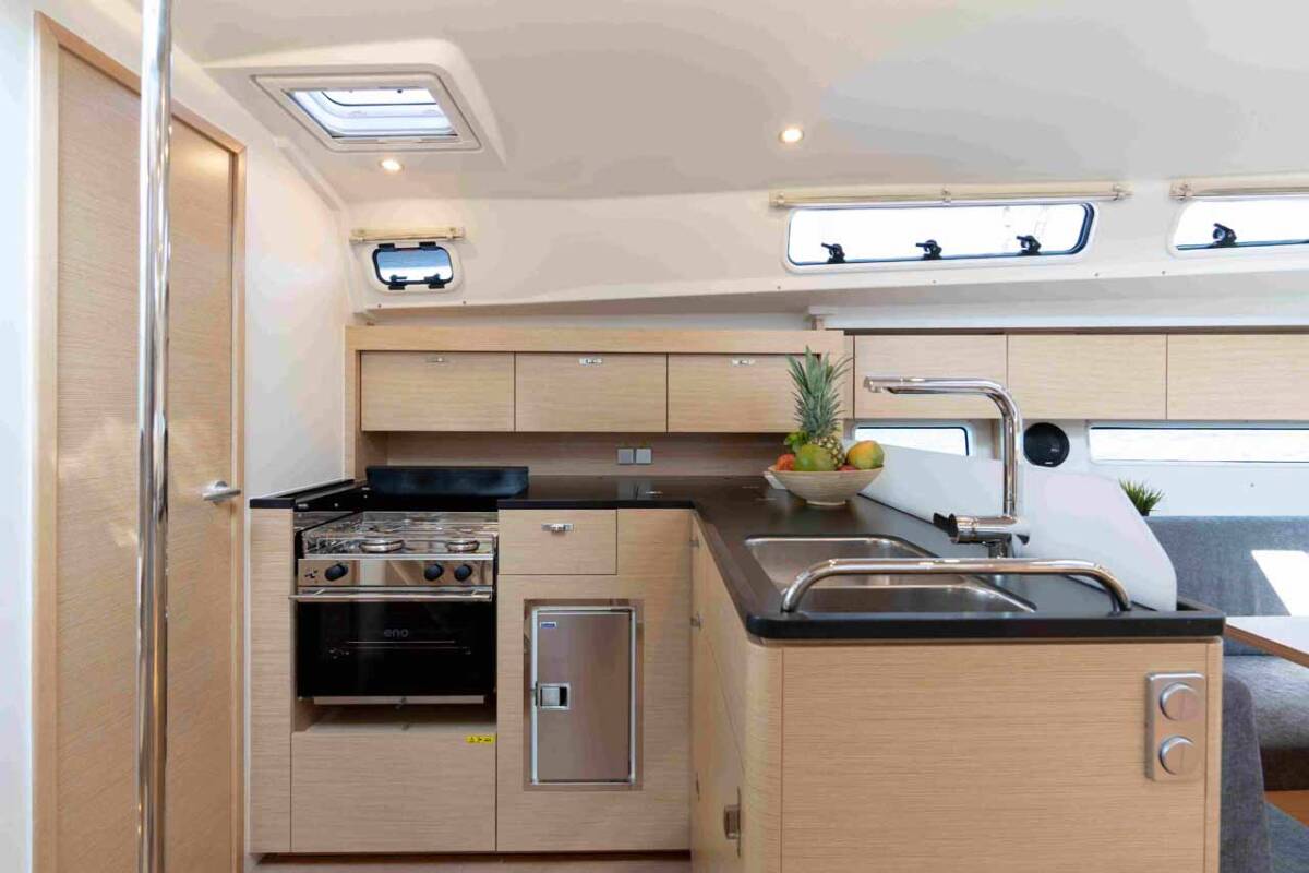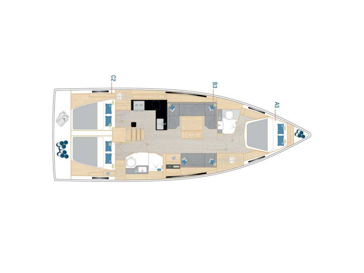 The Hanse 410 „Mare Sol“ offers special comfort with the following equipment features: Bow thruster, Cockpit cushions, Inverter, Electric toilet, Solar panels.