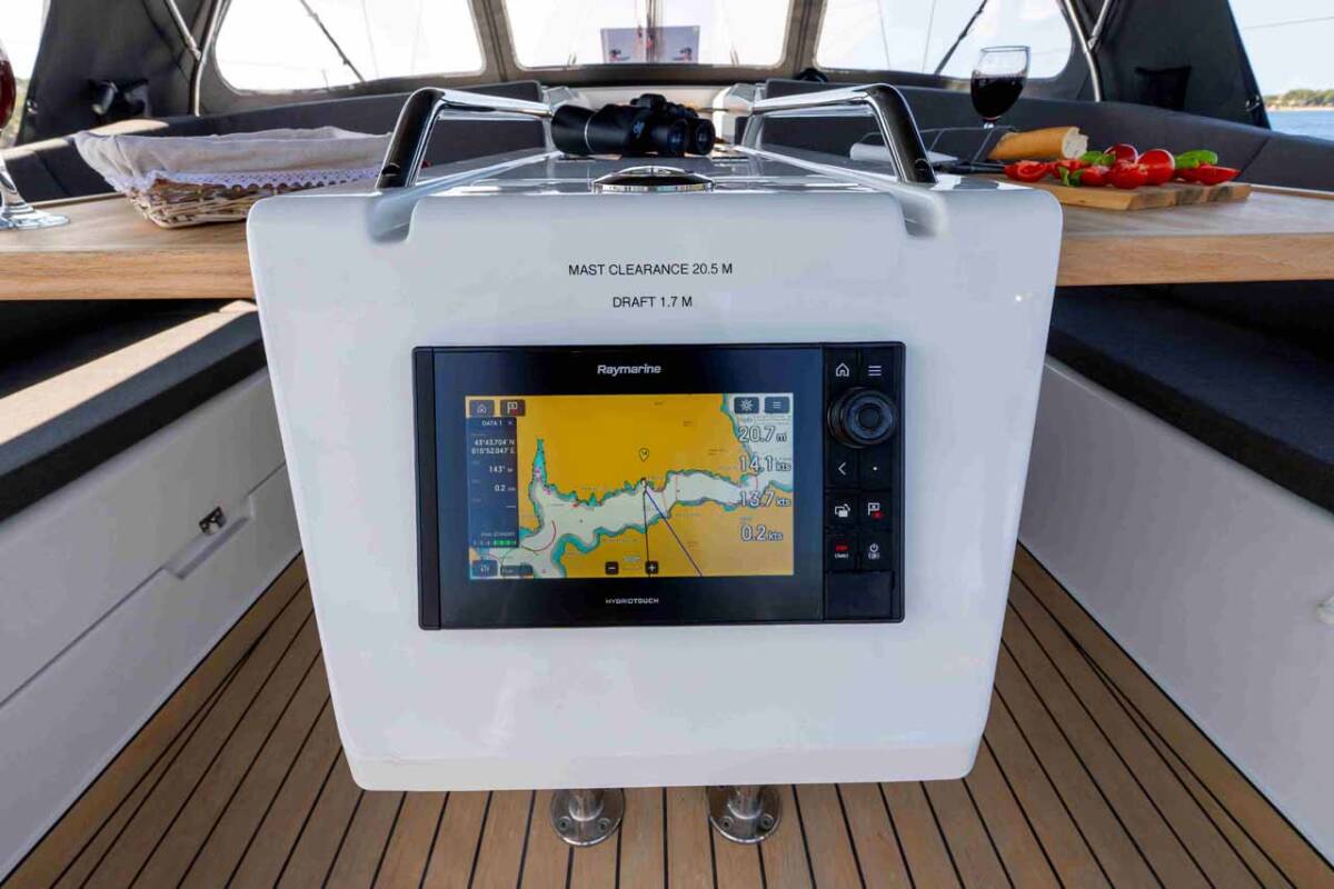 The Hanse 410 „Mare Sol“ is equipped with a mainsail and a genoa as well as a Bimini top, Autopilot, Sprayhood, Heating, Teak cockpit, GPS chart plotter - cockpit.