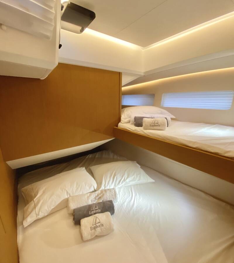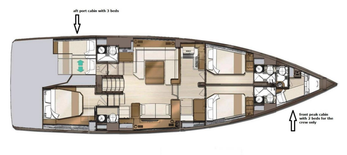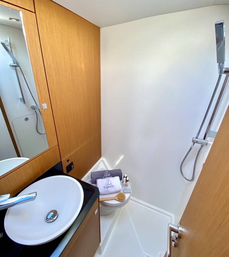 The Jeanneau 60 „Euphoria“ offers special comfort with the following equipment features: Bow thruster, Generator, Air Conditioning, Freezer, Cockpit cushions, Inverter, Electric toilet, Solar panels.