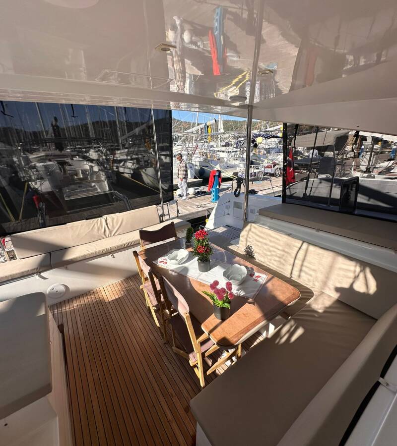 The Lagoon 40 „Miber Aries“ is equipped with a mainsail and a genoa as well as a Bimini top, Teak cockpit.