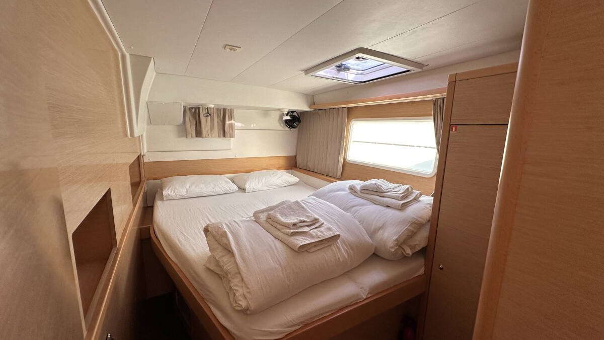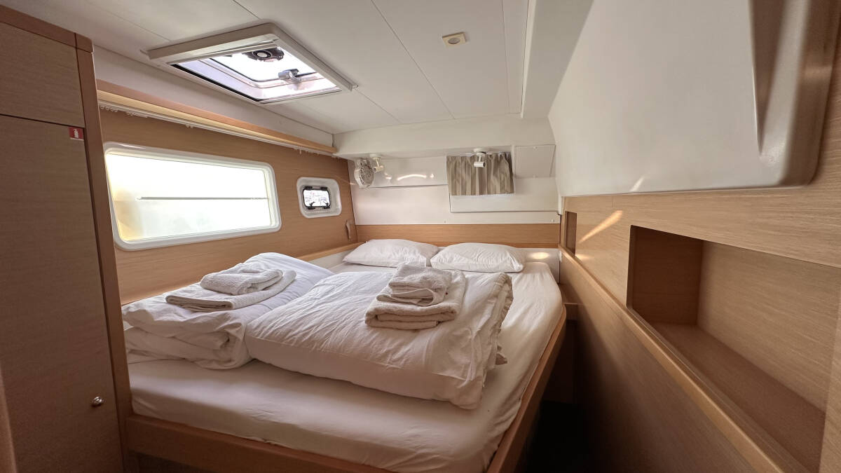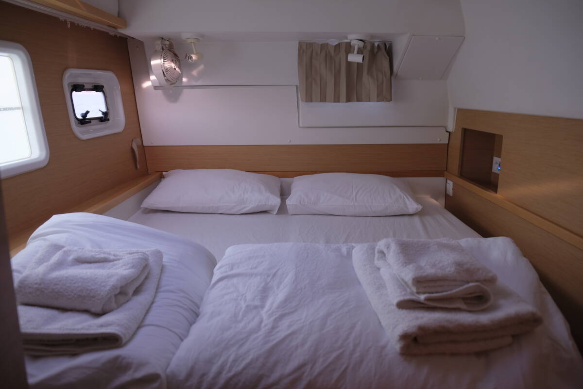 The Lagoon 400 „Santi“ offers special comfort with the following equipment features: Freezer, Cockpit cushions, Bathing platform, Inverter, Electric toilet, Solar panels.