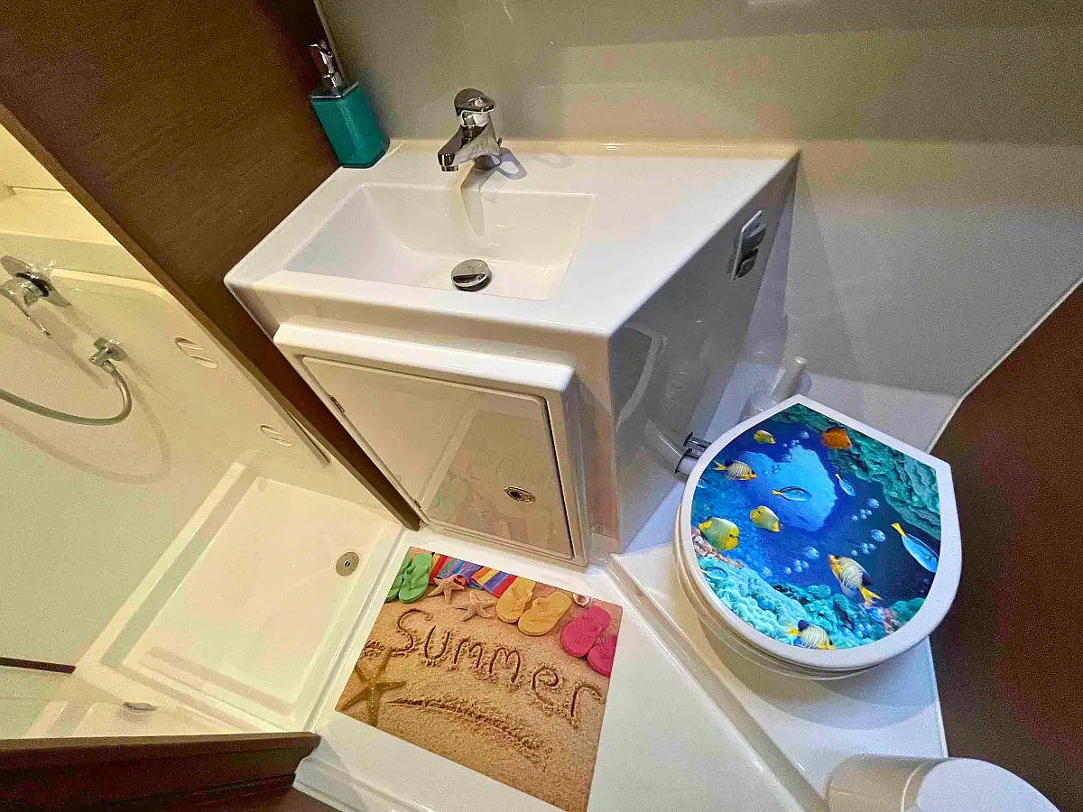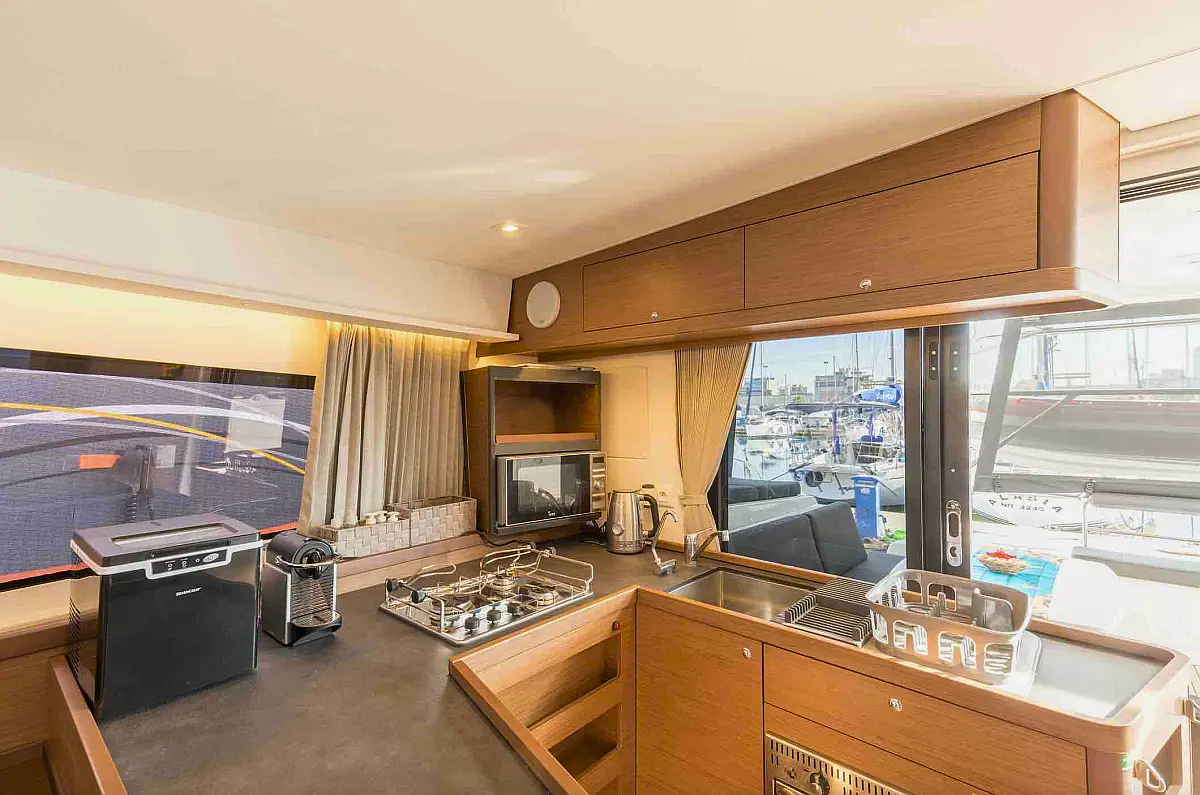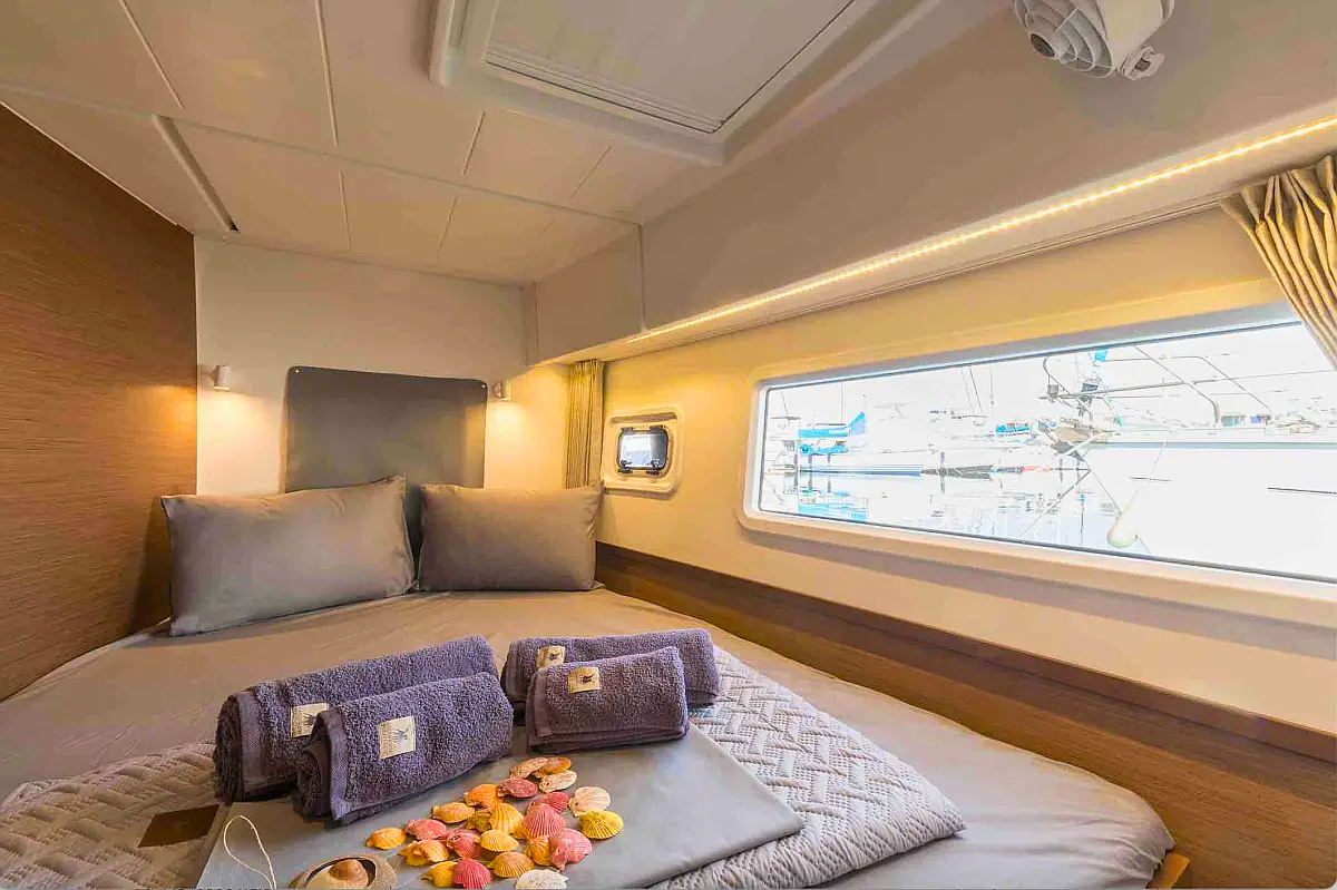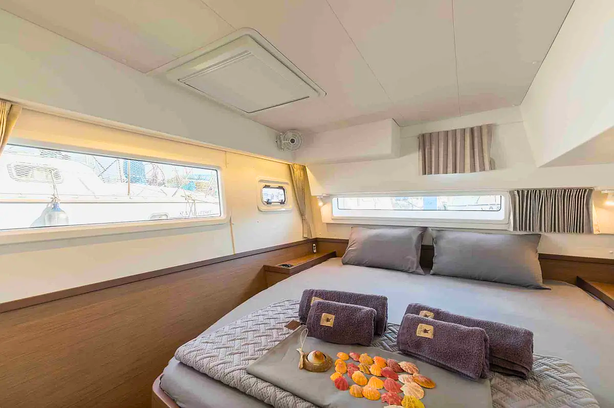 The Lagoon 42 „Rosa Dei Venti“ offers special comfort with the following equipment features: Generator, Air Conditioning, Inverter, Electric toilet, Solar panels.