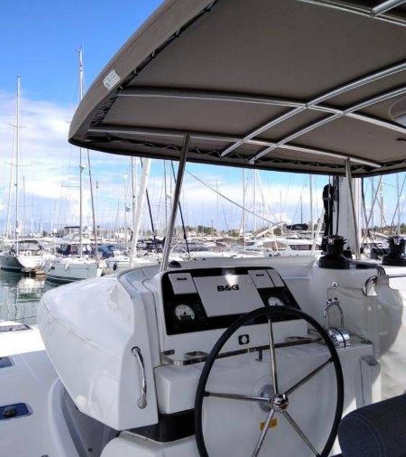The Lagoon 42 „Stolos“ is equipped with a mainsail and a genoa as well as a Bimini top, Autopilot, Teak cockpit, GPS chart plotter - cockpit.