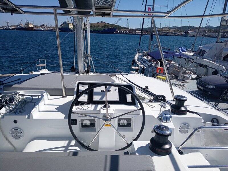 The Lagoon 450 F „Golden Dream“ is equipped with a mainsail and a genoa as well as a Bimini top, Autopilot, GPS chart plotter - cockpit.