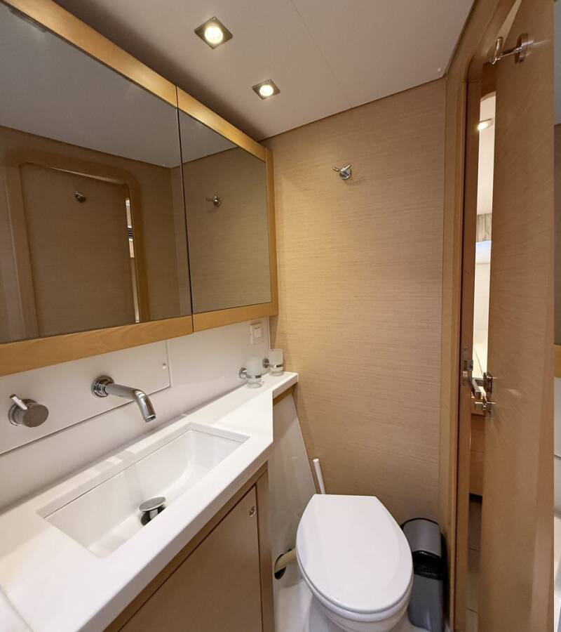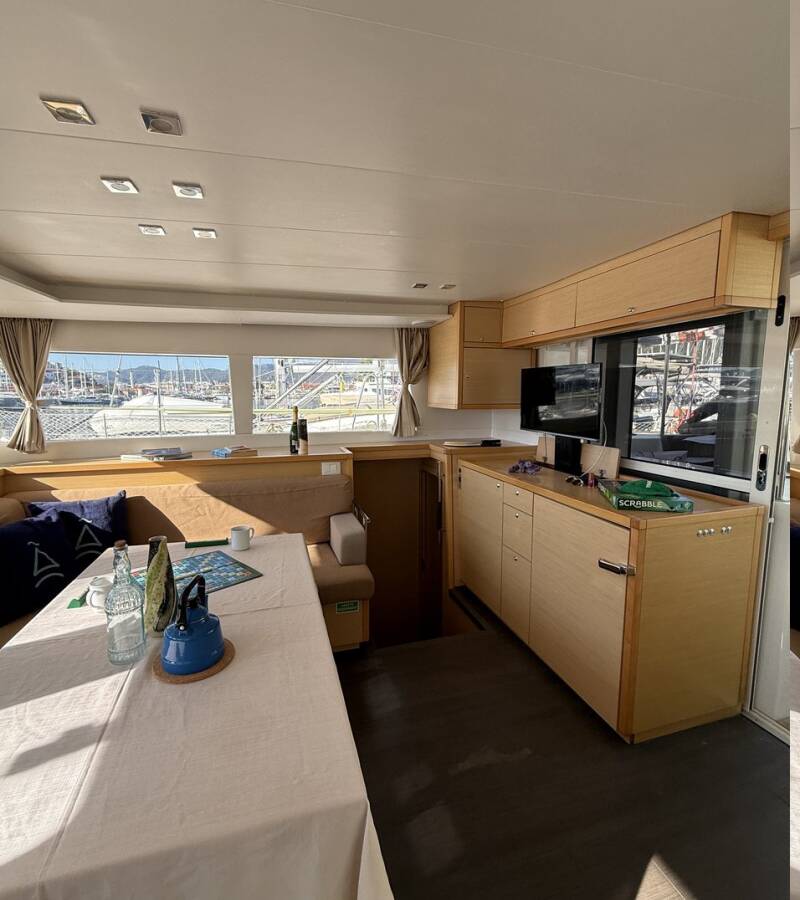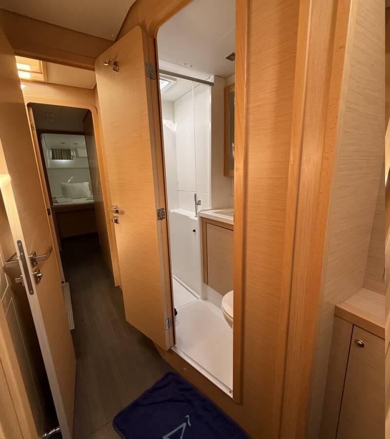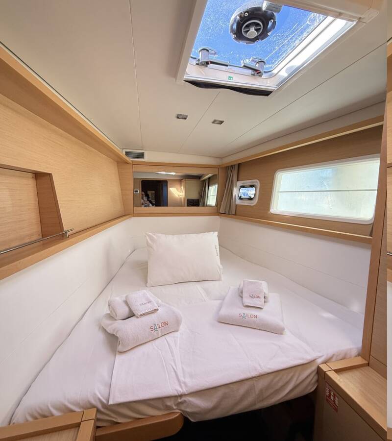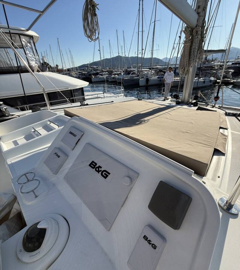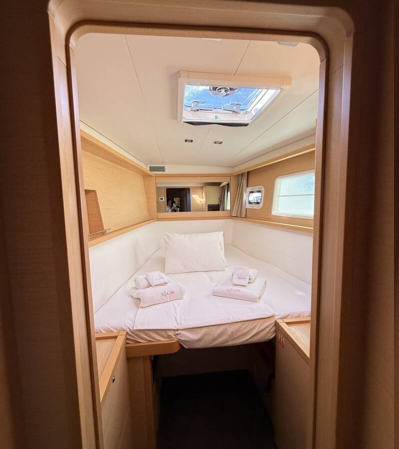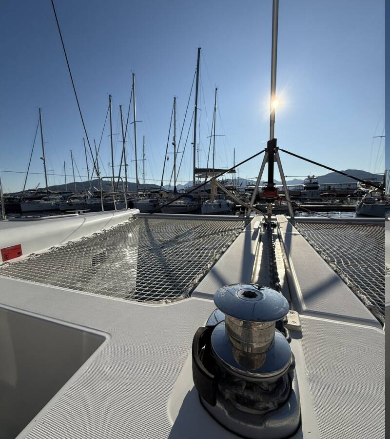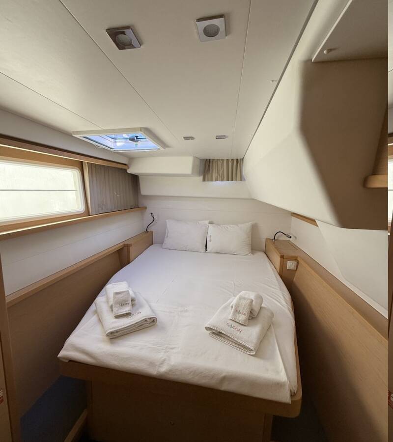 The 6-cabin catamaran Lagoon 450F - Lu Lu was built in 2015 and is docked at Albatros Marina, Turkey. Lu Lu can accommodate up to 10 people in 2 single cabins, 4 double cabins, and a large saloon. Pillows, blankets, towels, and bed linen are included in the price. Lu Lu offers 4 toilets with showers. Boat equipment includes a classic mainsail, solar panels, generator, bimini, and an outside GPS plotter. Additional amenities include a flat-screen TV, heating, air conditioning, and an audio system. The fully equipped galley includes a fridge, oven, cooker, sink, and kitchen utensils.
