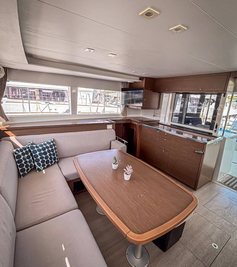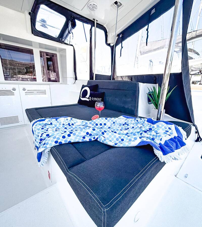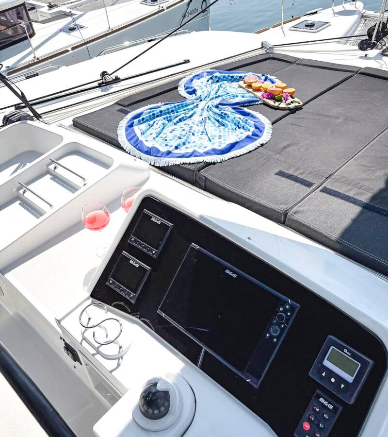 The Lagoon 450 F „Red Twin II“ is equipped with a mainsail and a genoa as well as a Bimini top, Autopilot, Heating.