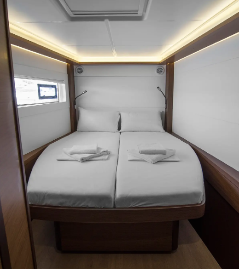 The Lagoon 46 „G. P“ offers special comfort with the following equipment features: Generator, Air Conditioning, Freezer, Cockpit cushions, Inverter, Electric toilet.