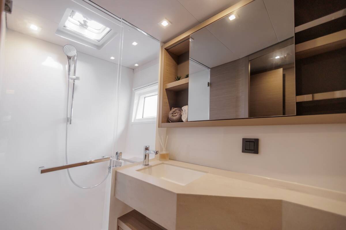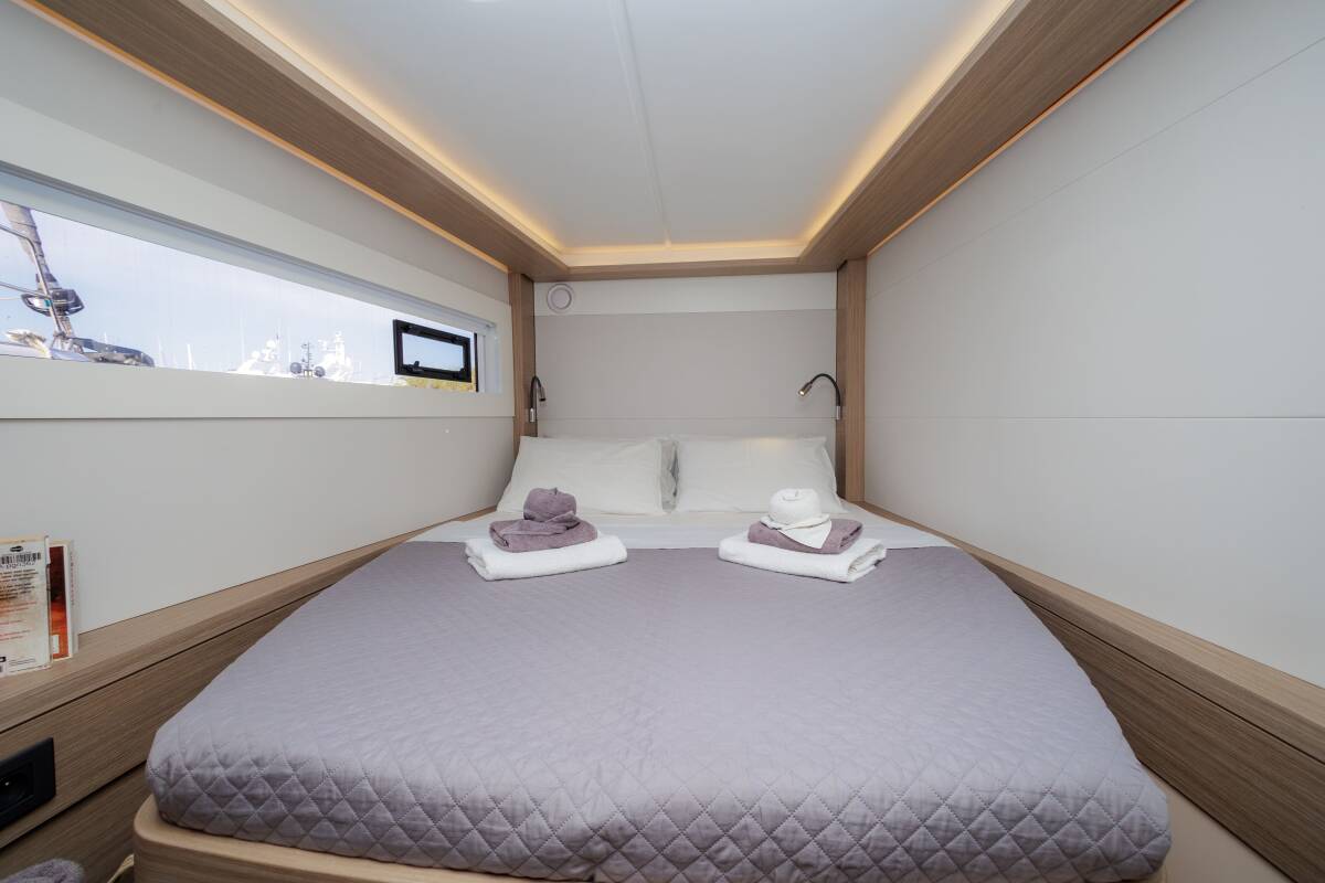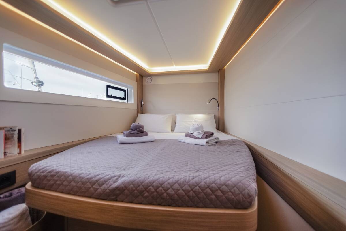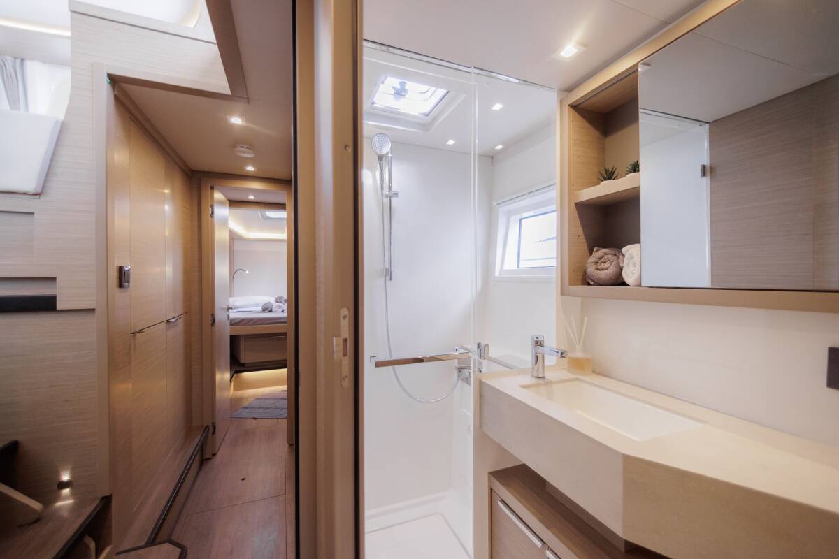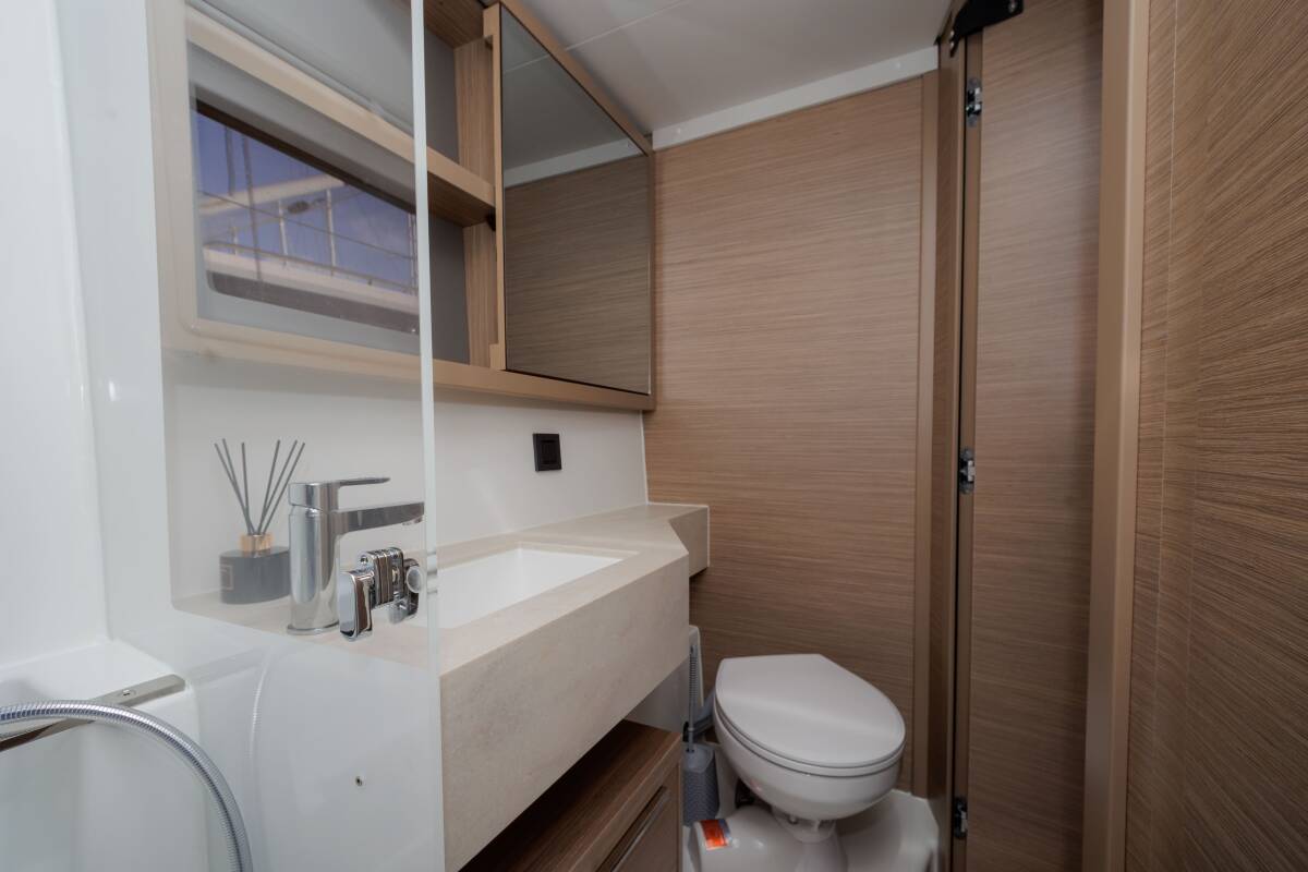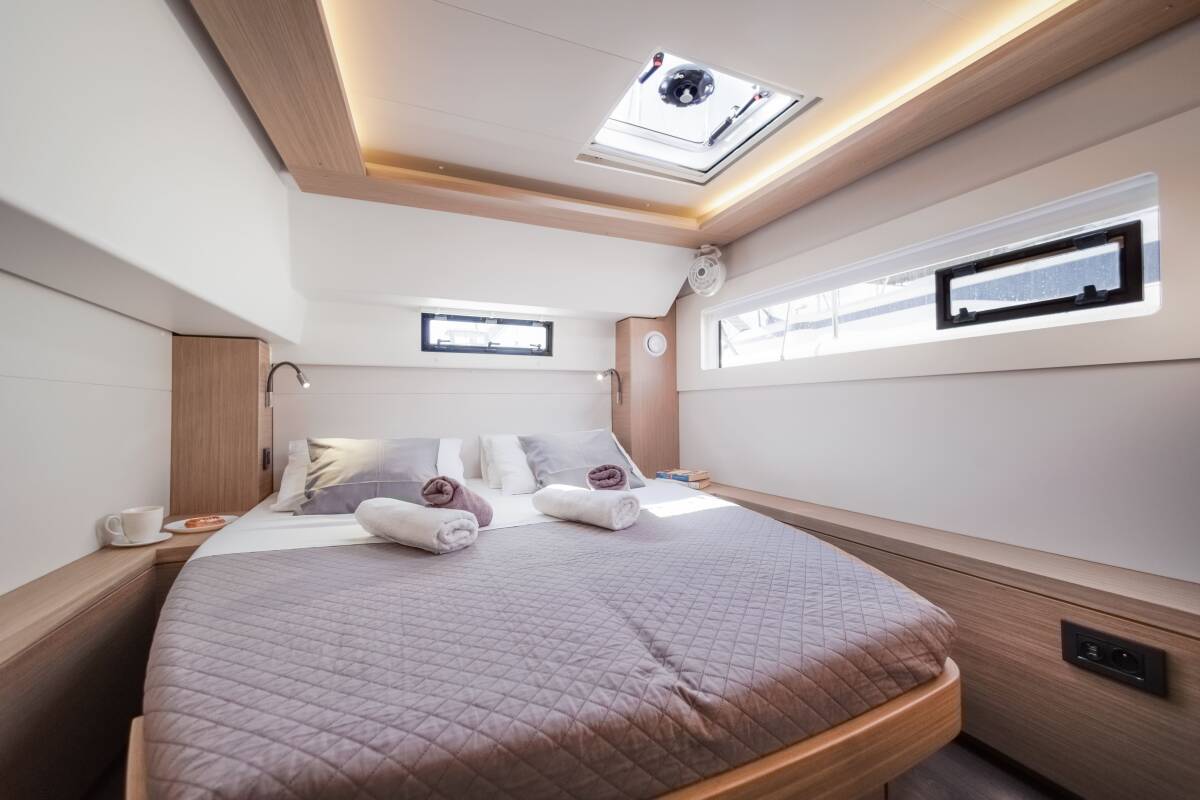 The Lagoon 46 „Iris“ offers special comfort with the following equipment features: Generator, Air Conditioning, Freezer, Electric toilet, Solar panels.