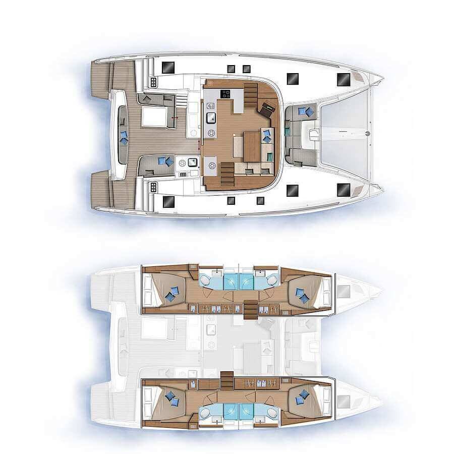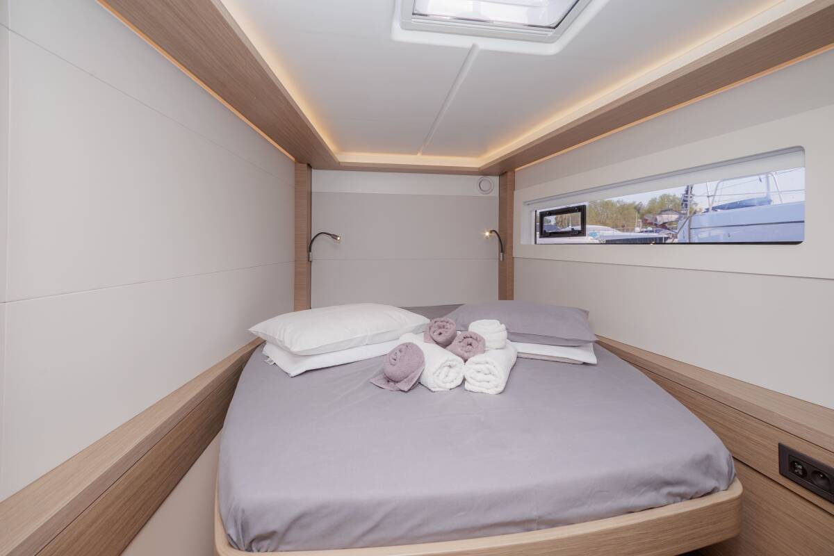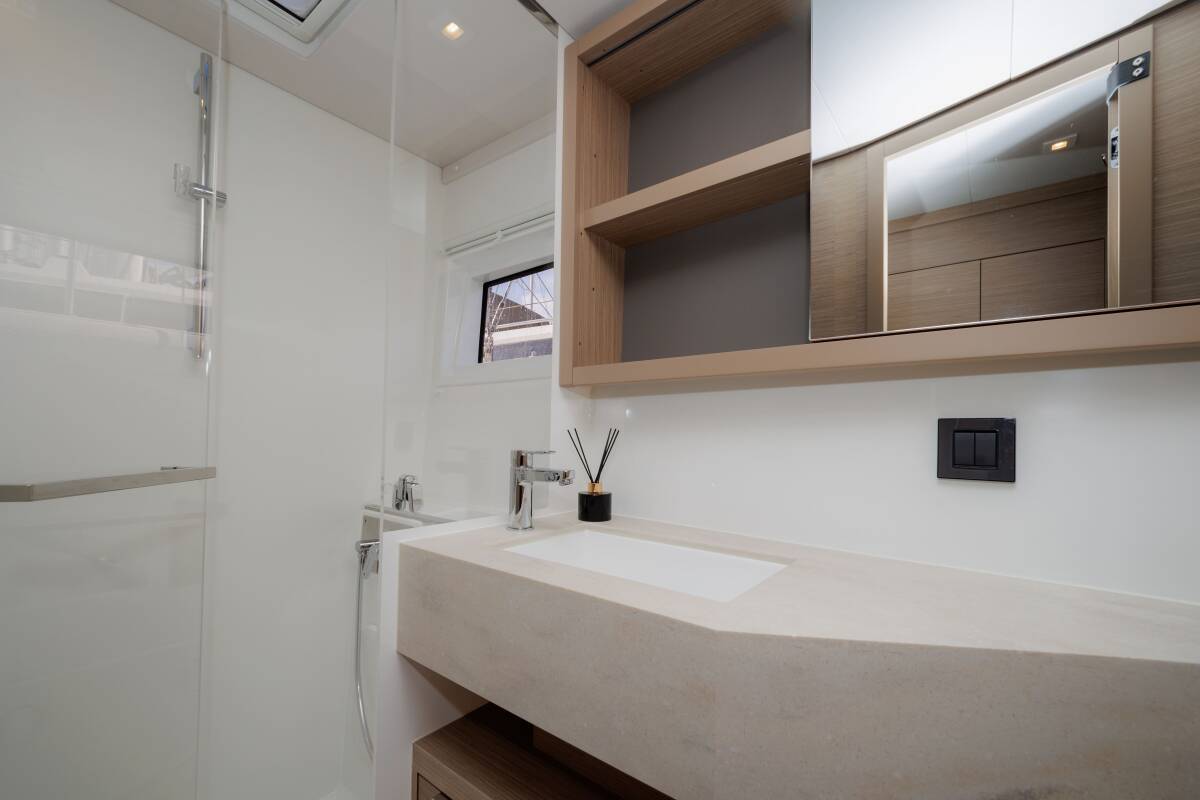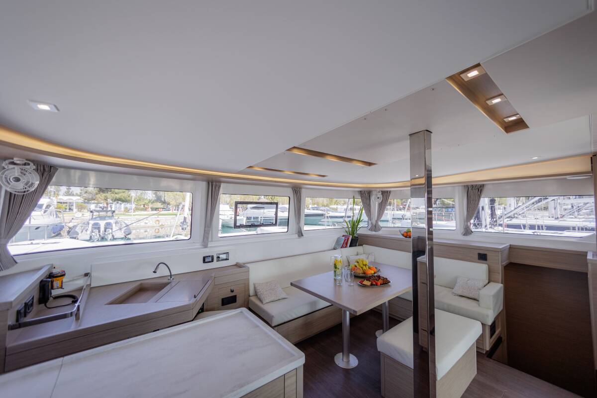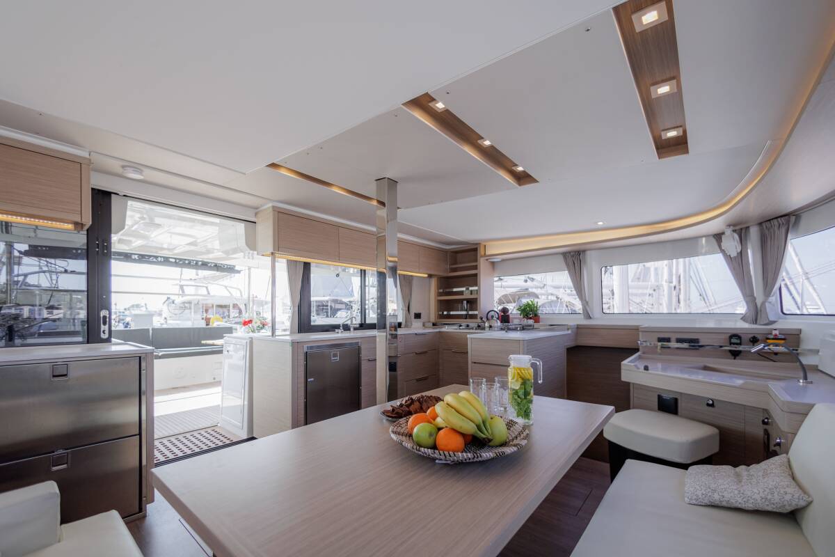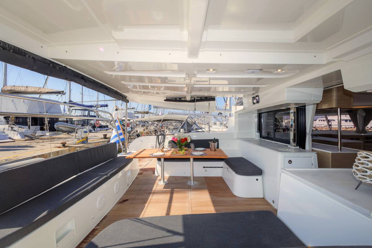 The Lagoon 46 „Iris“ offers special comfort with the following equipment features: Generator, Air Conditioning, Freezer, Electric toilet, Solar panels.