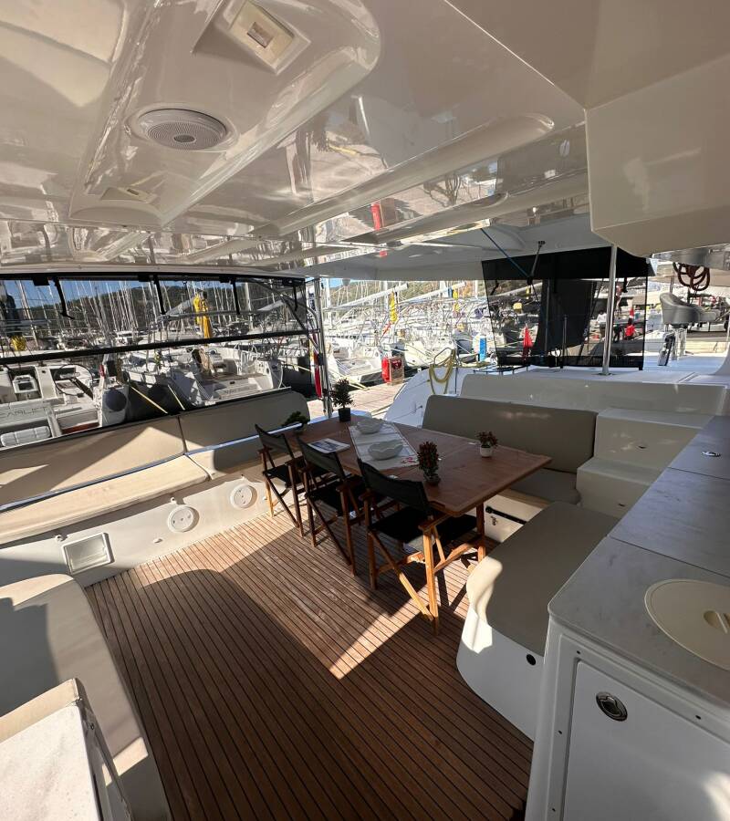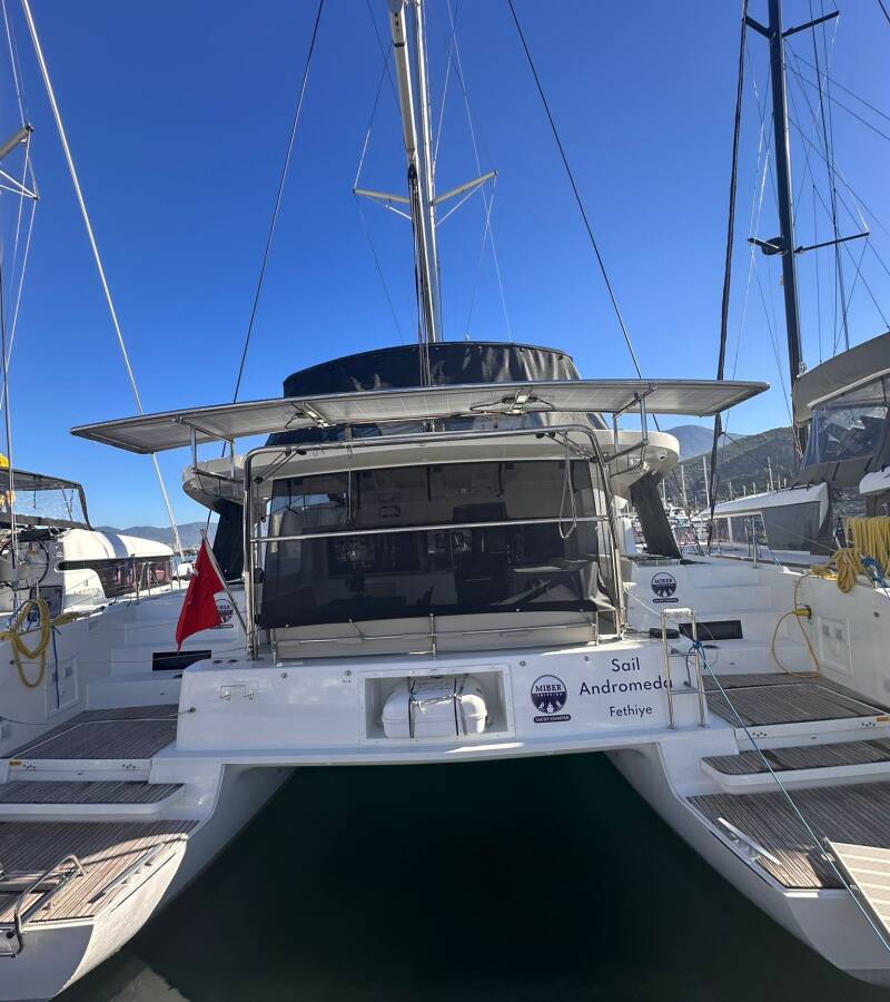 The Lagoon 46 „Miber Andromeda“ is equipped with a mainsail and a genoa as well as a Bimini top, Teak cockpit.