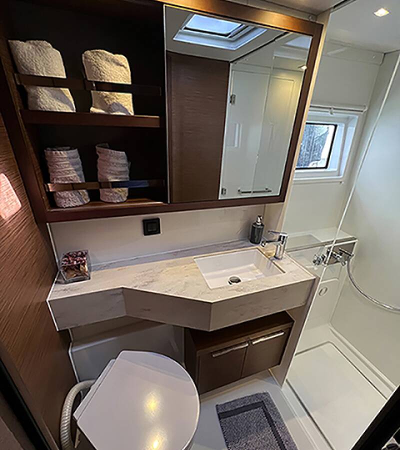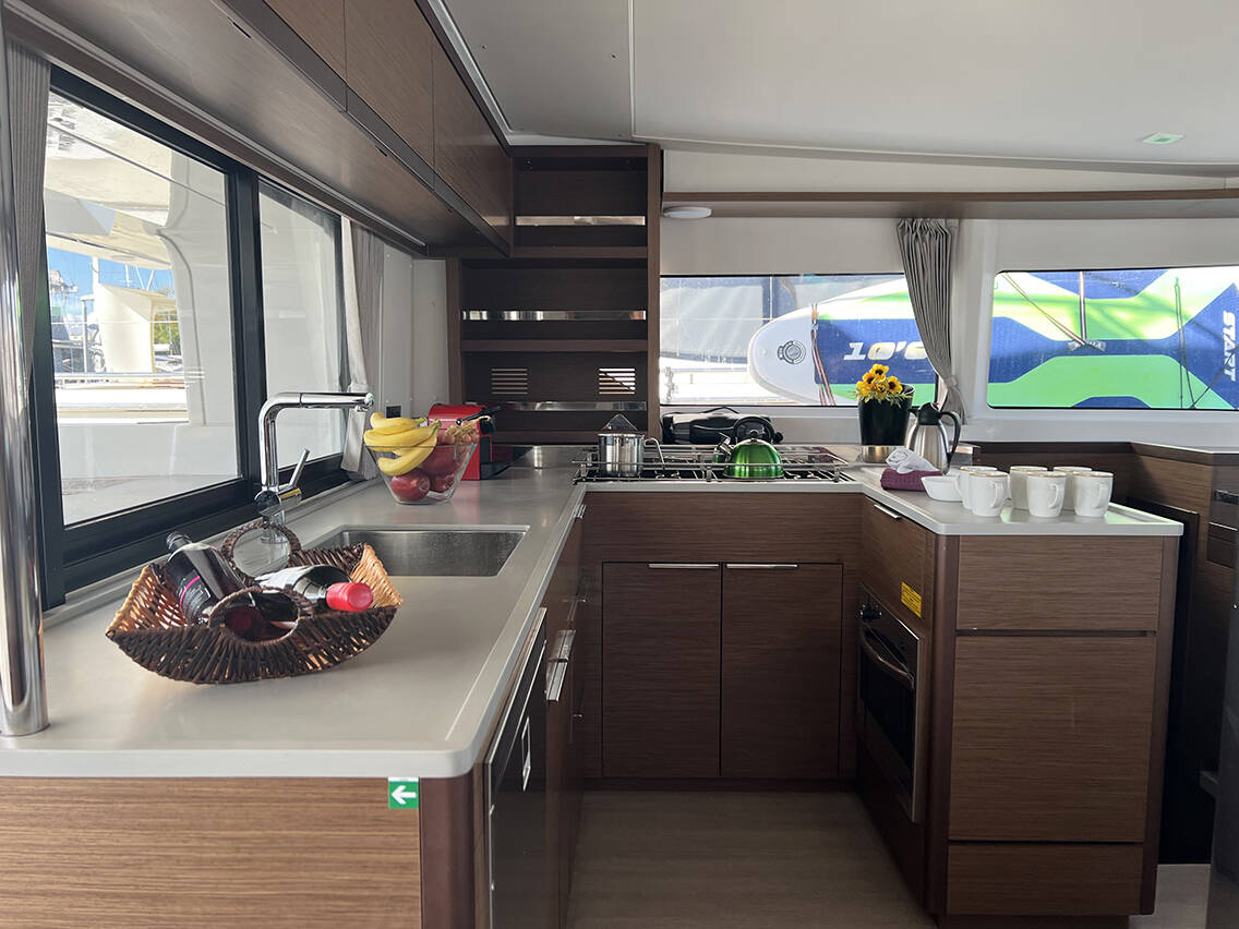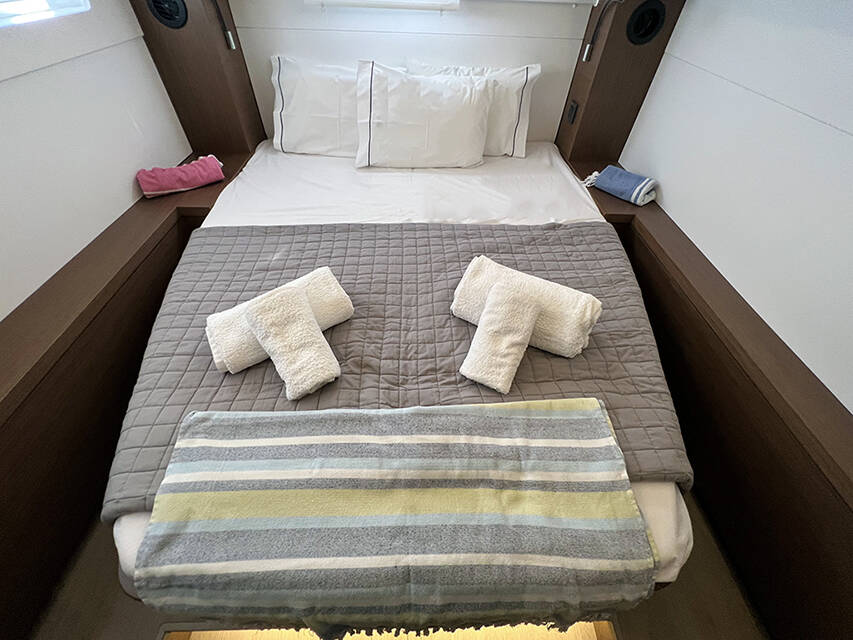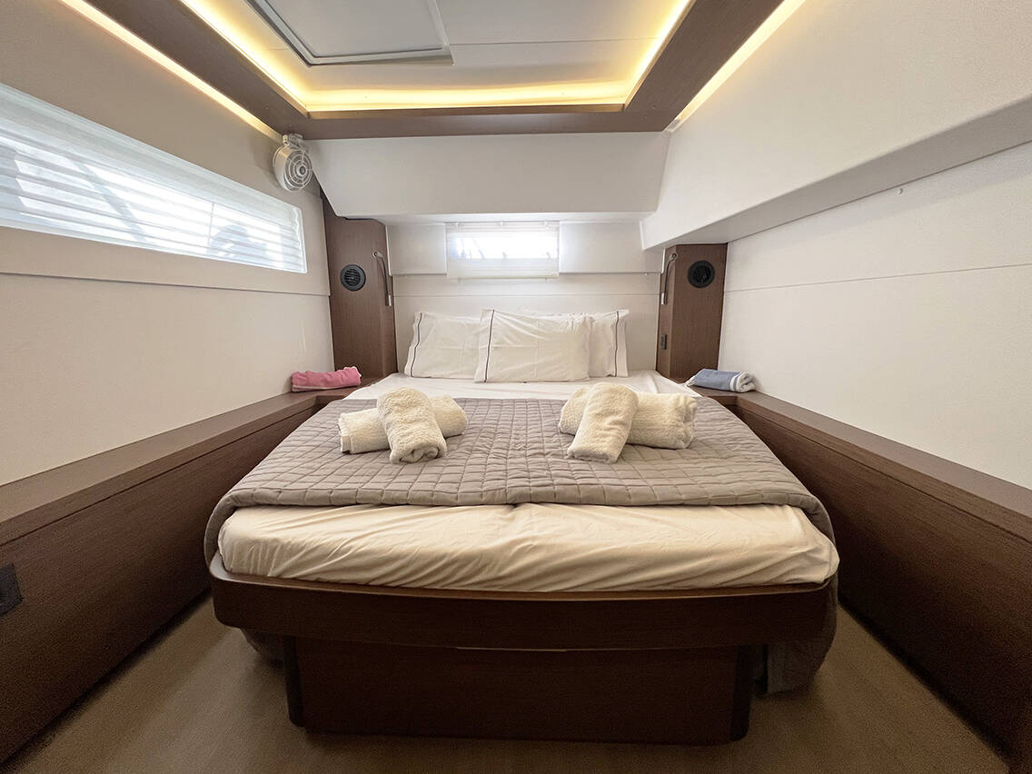 The Lagoon 46 „Mple“ offers special comfort with the following equipment features: Generator, Air Conditioning, Freezer, Cockpit cushions, Inverter, Electric toilet.