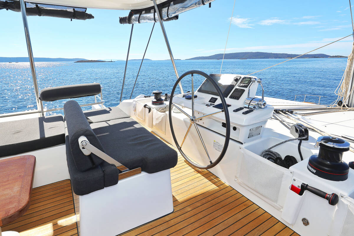 The Lagoon 51 „Maestro“ is equipped with a mainsail and a genoa as well as a Bimini top, Autopilot, Heating, Teak cockpit, GPS chart plotter - cockpit.