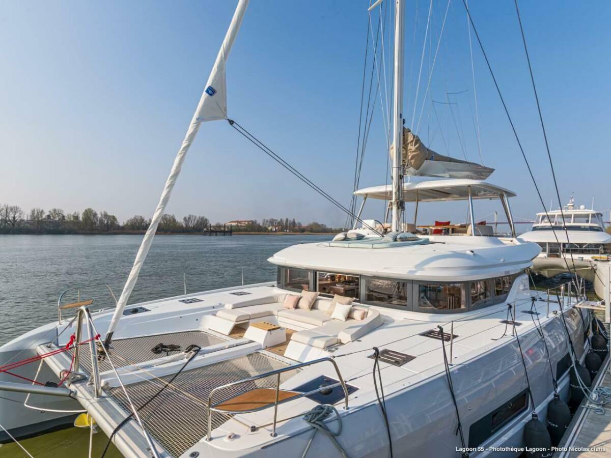 The Lagoon 55 „Smiley“ is equipped with a mainsail and a genoa as well as a Autopilot, Sonar.