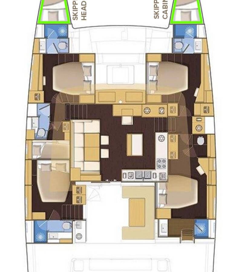 The Lagoon 560 „Topaz“ offers special comfort with the following equipment features: Bow thruster, Generator, Air Conditioning, Freezer, Cockpit cushions, Inverter, Electric toilet, Dishwasher, Solar panels.