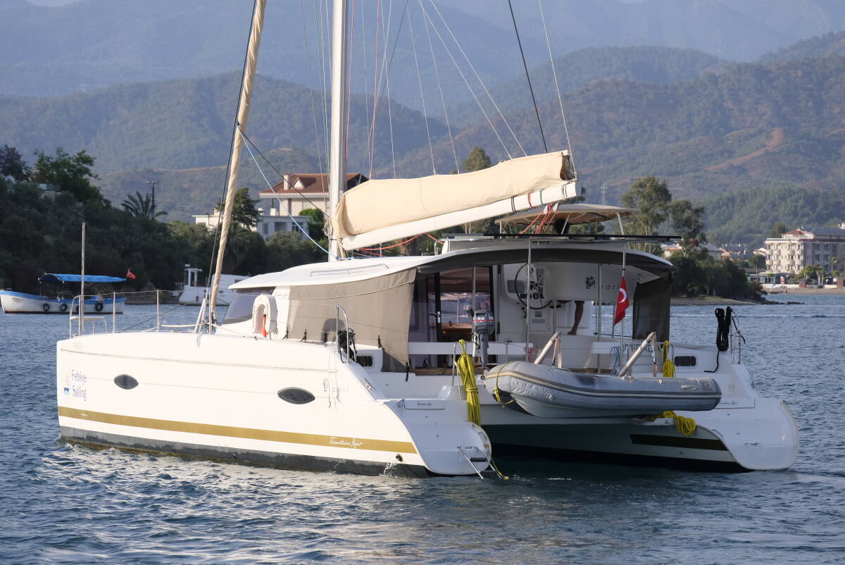 The Catamaran Lipari 41 „Mirada“, built in 2013, is moored in Fethiye, Fethiye Sailing Club - Turkey. The yacht has 4 + 2 cabins, can accomodate 8 + 2 persons and has 4 toilets/showers.