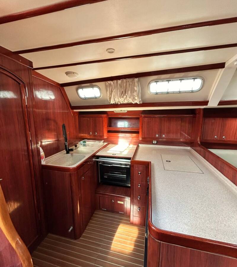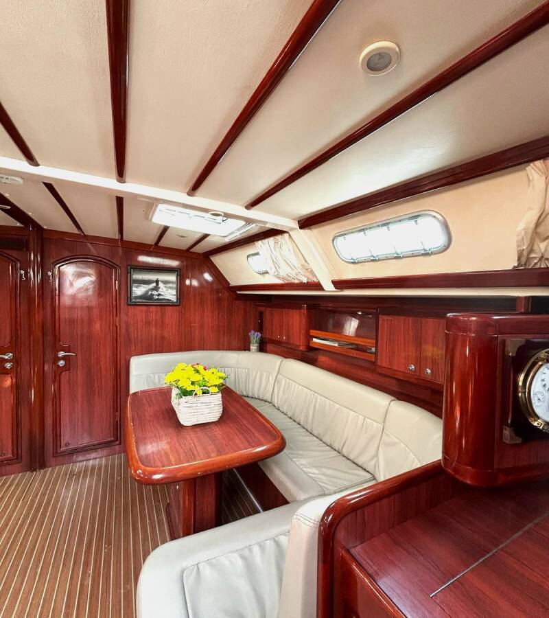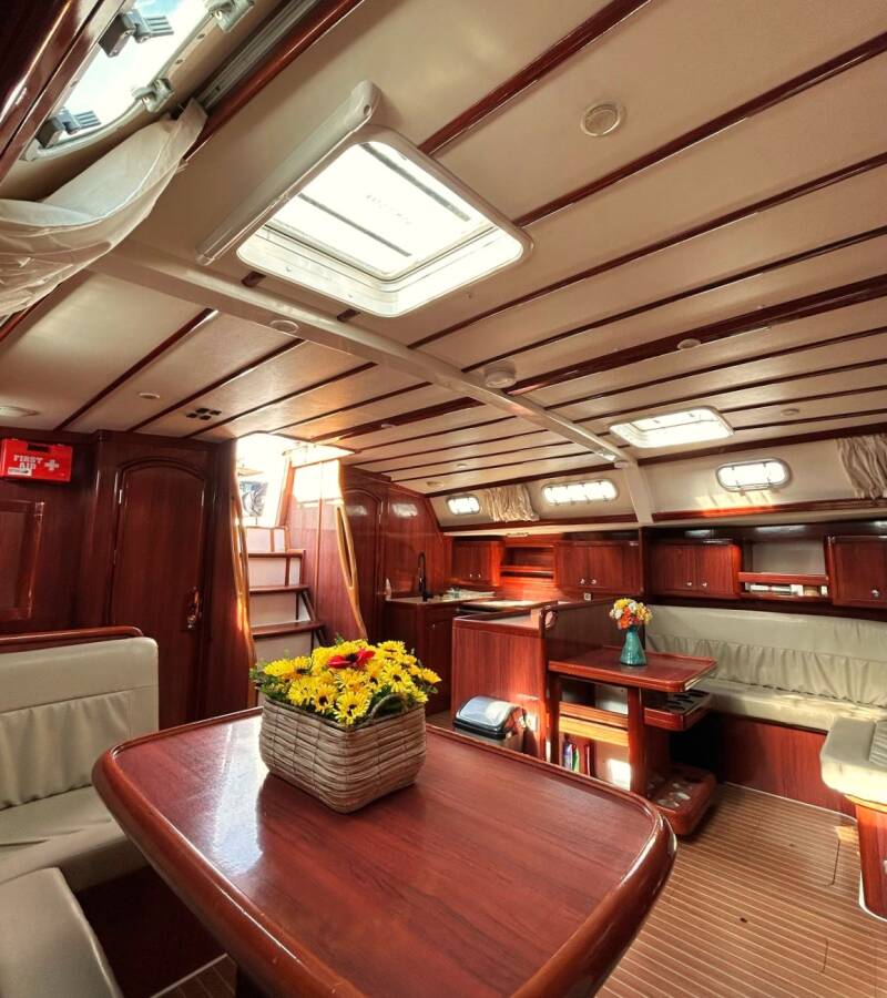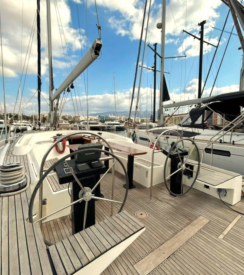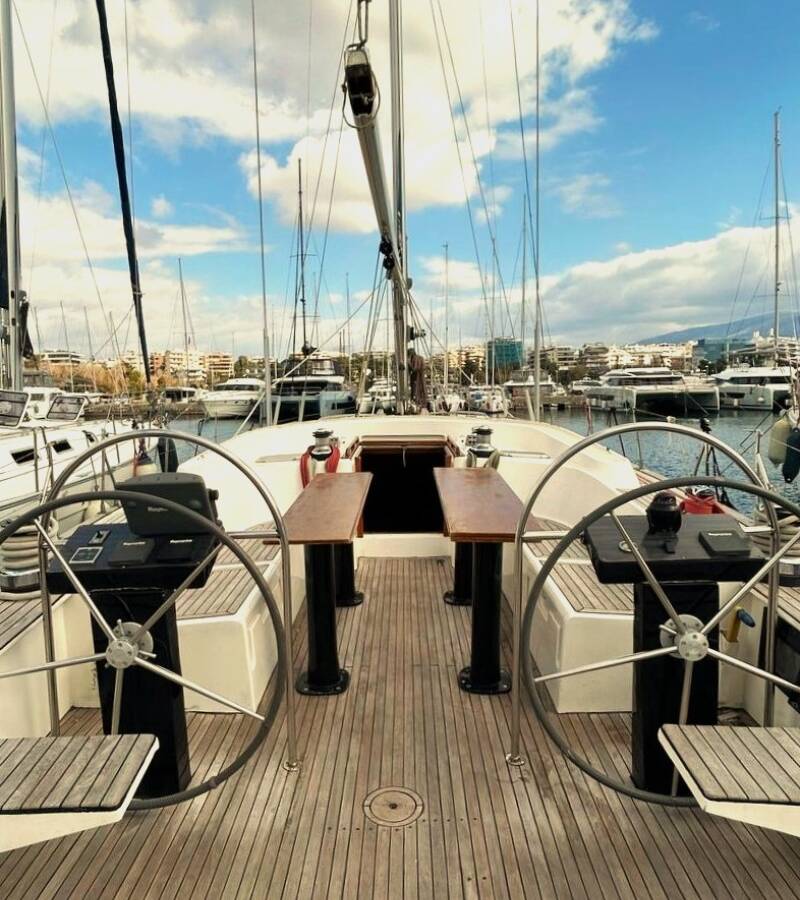 The Ocean Star 58.4 „Alexandros“ is equipped with a mainsail and a genoa as well as a Bimini top, Autopilot, Sprayhood, Heating.