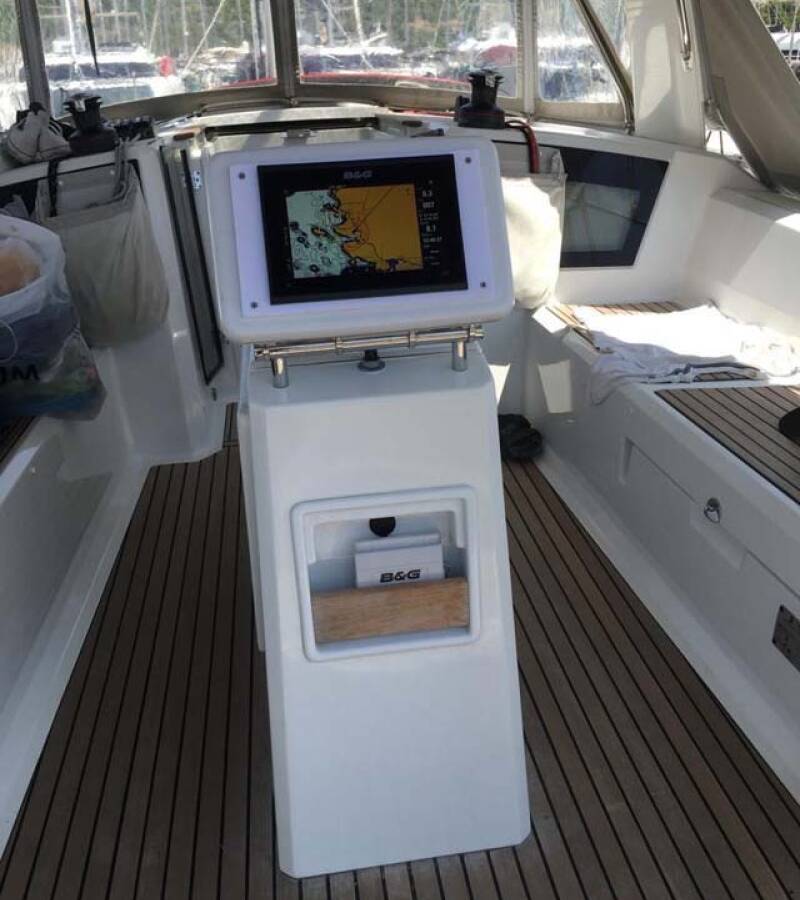 The Oceanis 38.1 „Eleven“ is equipped with a mainsail and a genoa as well as a Radar, Bimini top, Autopilot, Sprayhood, Heating, Teak cockpit, GPS chart plotter - cockpit.