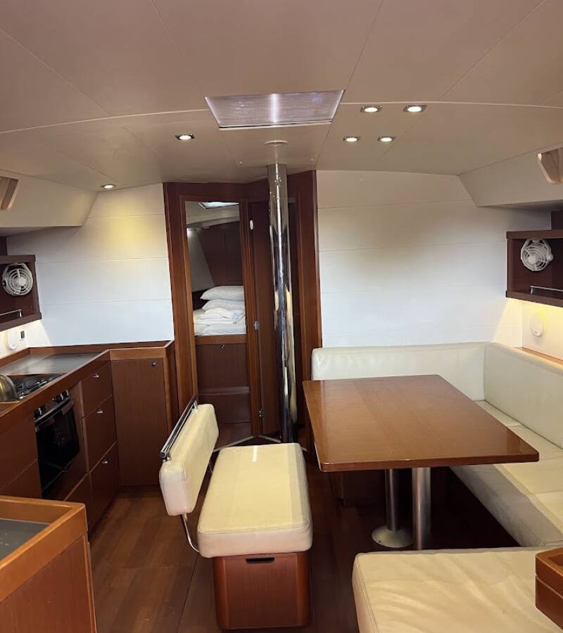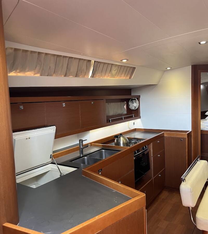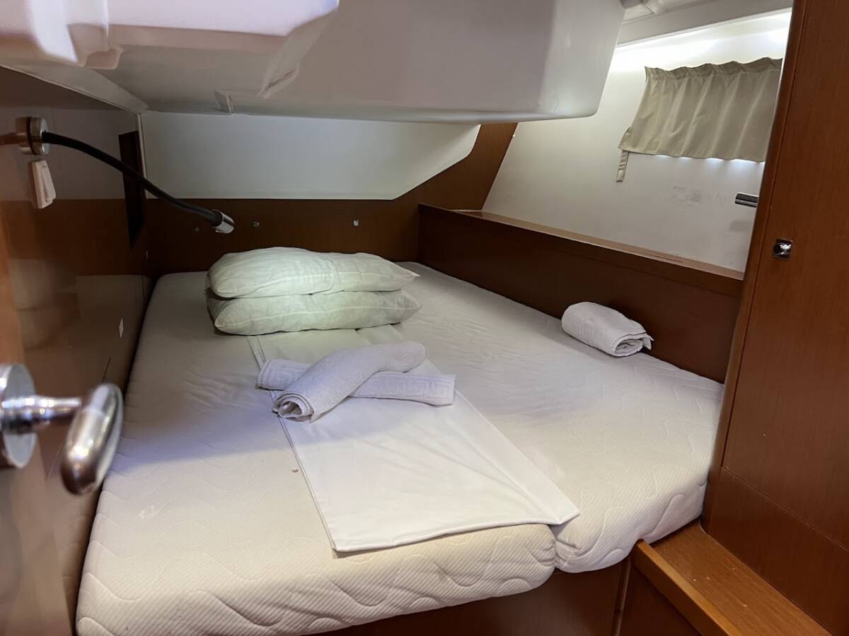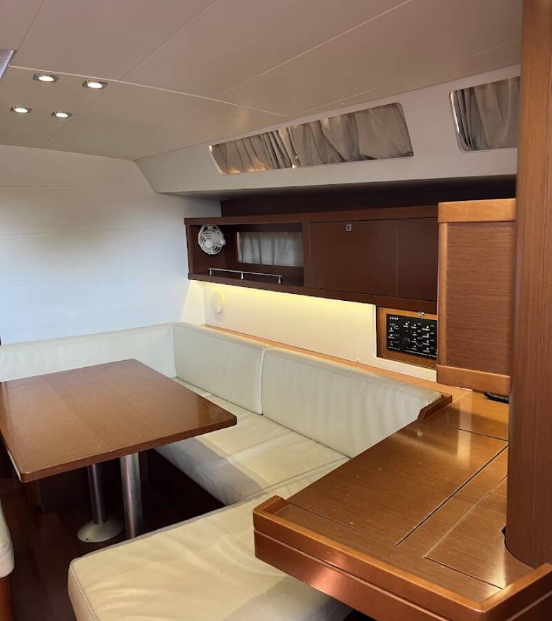 The Oceanis 45 „Beautiful Love“ is equipped with a mainsail and a genoa as well as a Bimini top, Autopilot, Sprayhood, Teak cockpit.