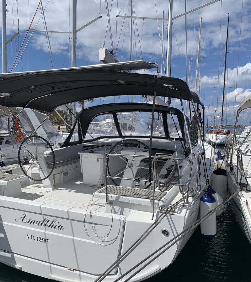 The Oceanis 46.1 „Amalthia“ is equipped with a mainsail and a genoa as well as a Bimini top, Autopilot, Sprayhood.