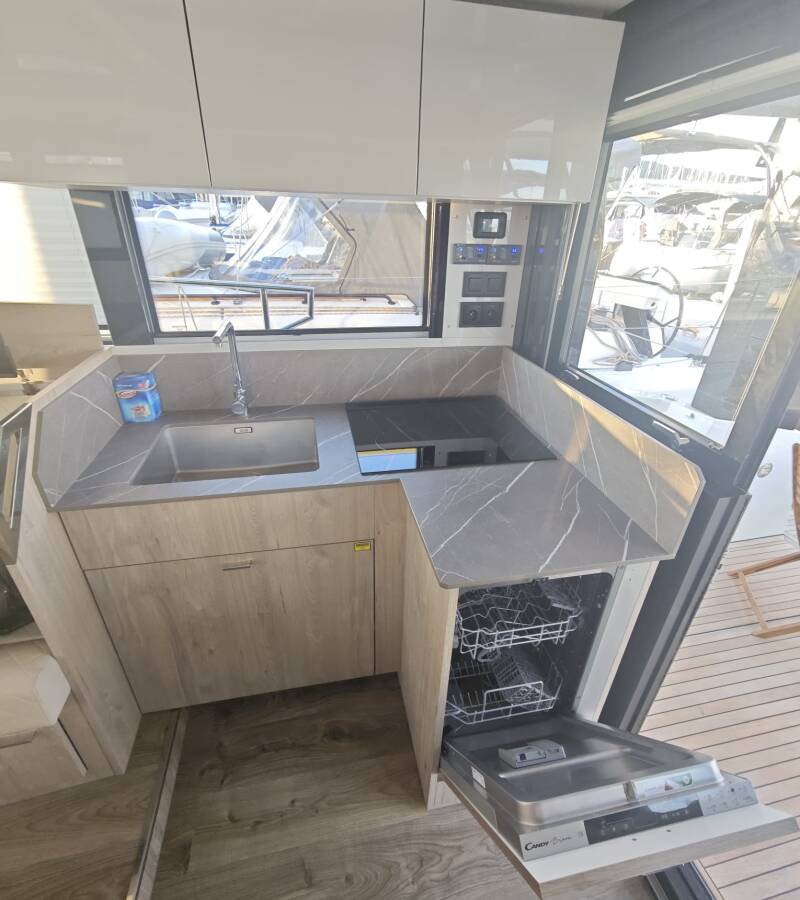The Seamaster 45 „Mackata“ offers special comfort with the following equipment features: Bow thruster, Air Conditioning, Cockpit cushions, Bathing platform, Inverter, Electric toilet, Dishwasher, Solar panels.