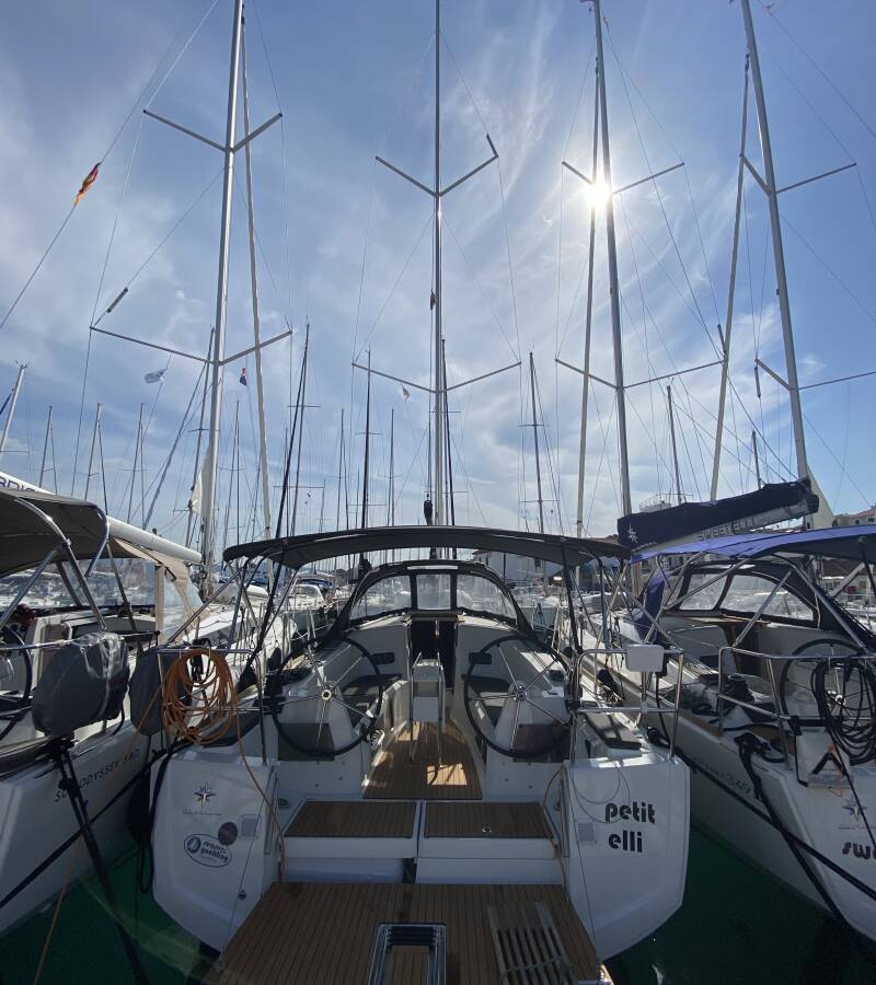 The Sun Odyssey 349 „petit elli“ offers special comfort with the following equipment features: Bow thruster, Freezer, Bathing platform, Solar panels.