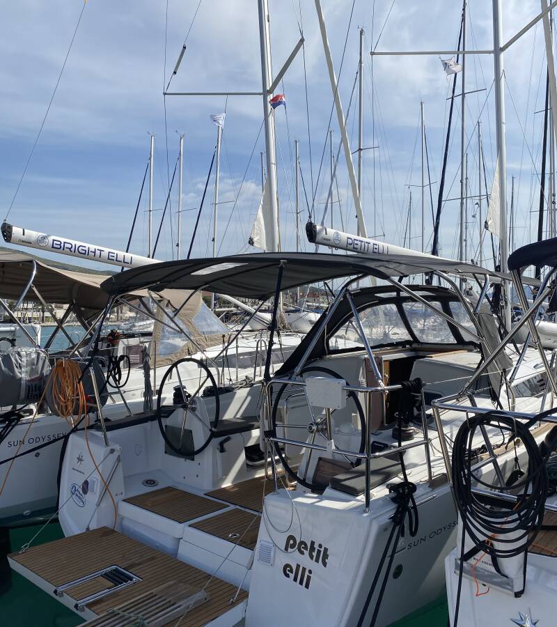 The Sun Odyssey 349 „petit elli“ is equipped with a mainsail and a genoa as well as a Bimini top, Autopilot, Sprayhood, Heating, Teak cockpit.