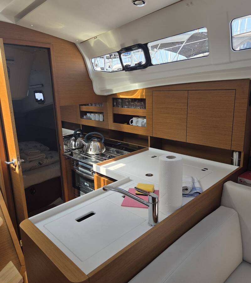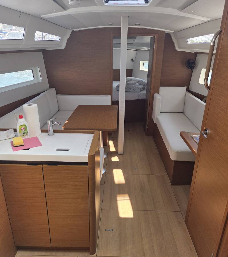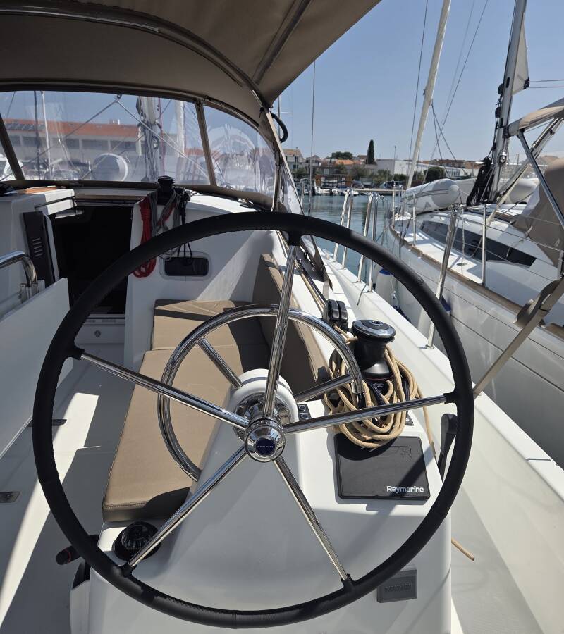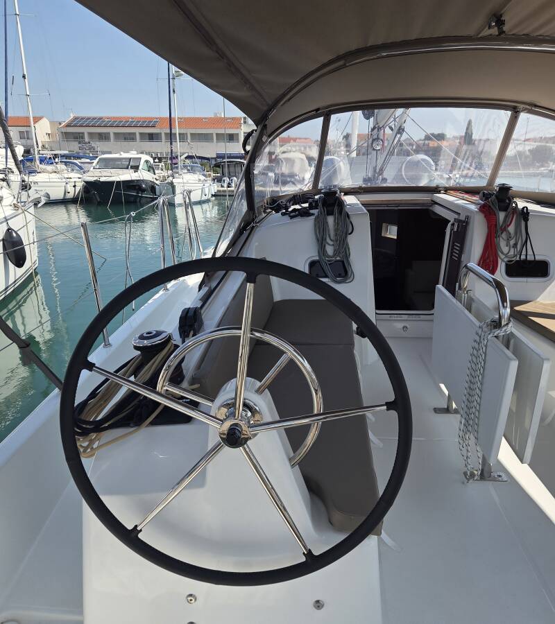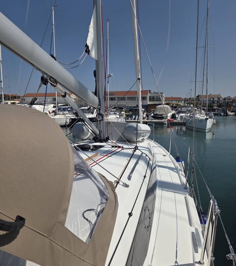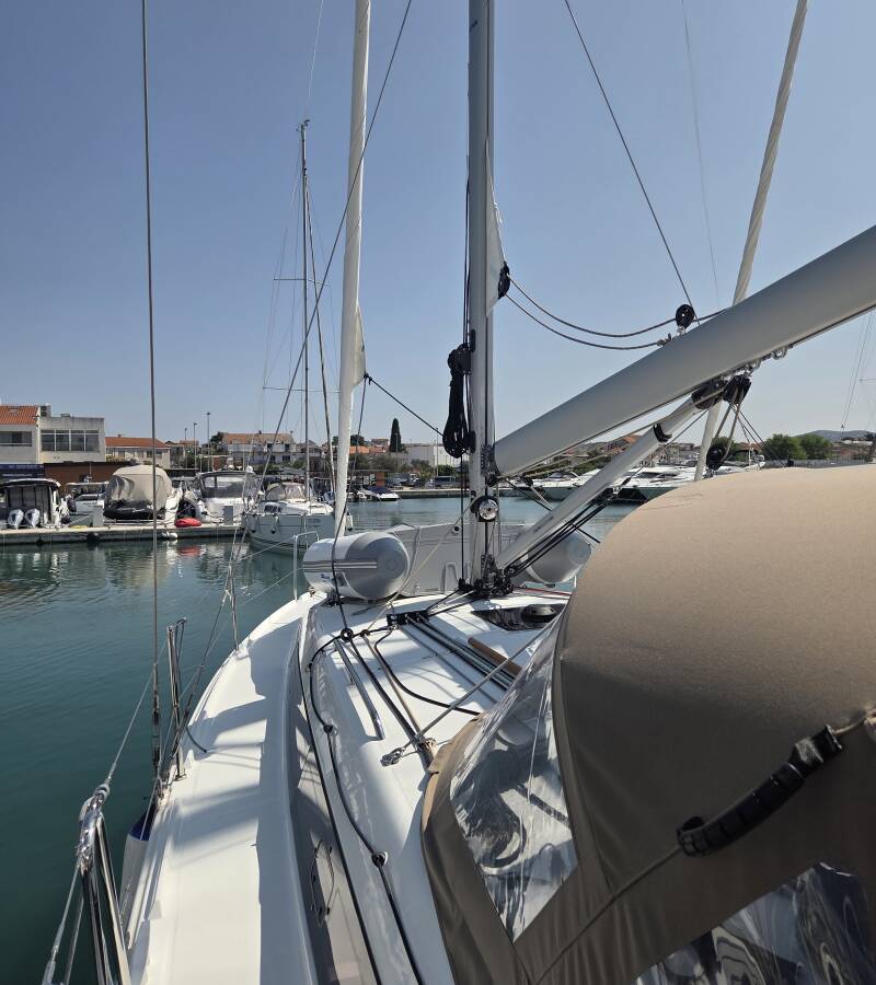 The Sun Odyssey 380 „Ancsika“ is equipped with a mainsail and a genoa as well as a Bimini top, Autopilot, Sprayhood.