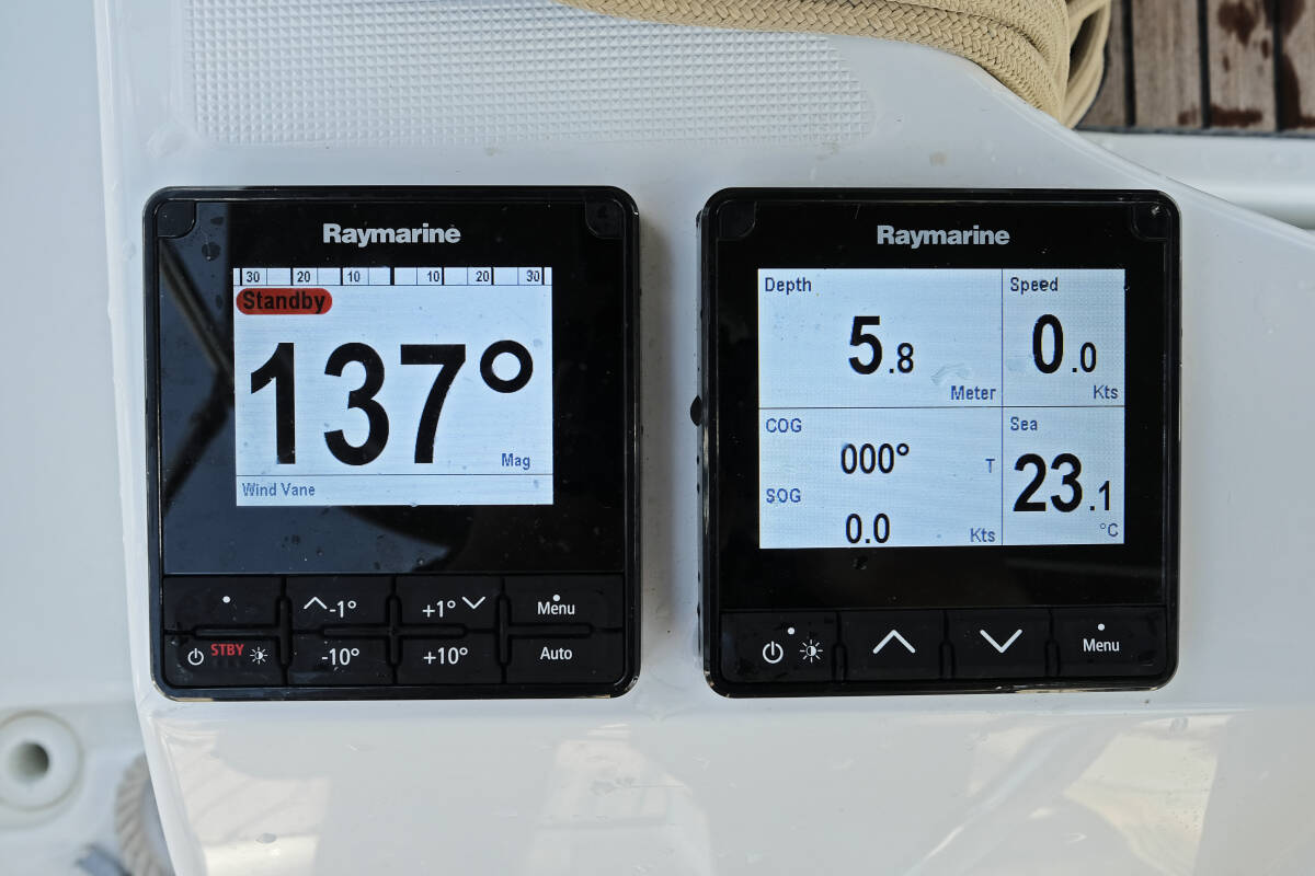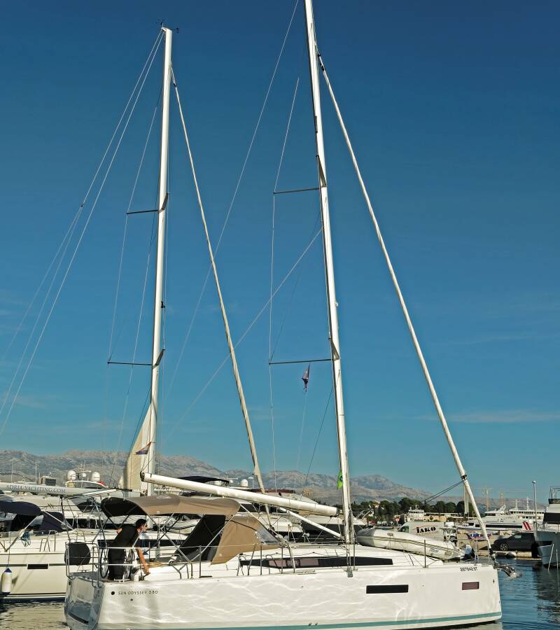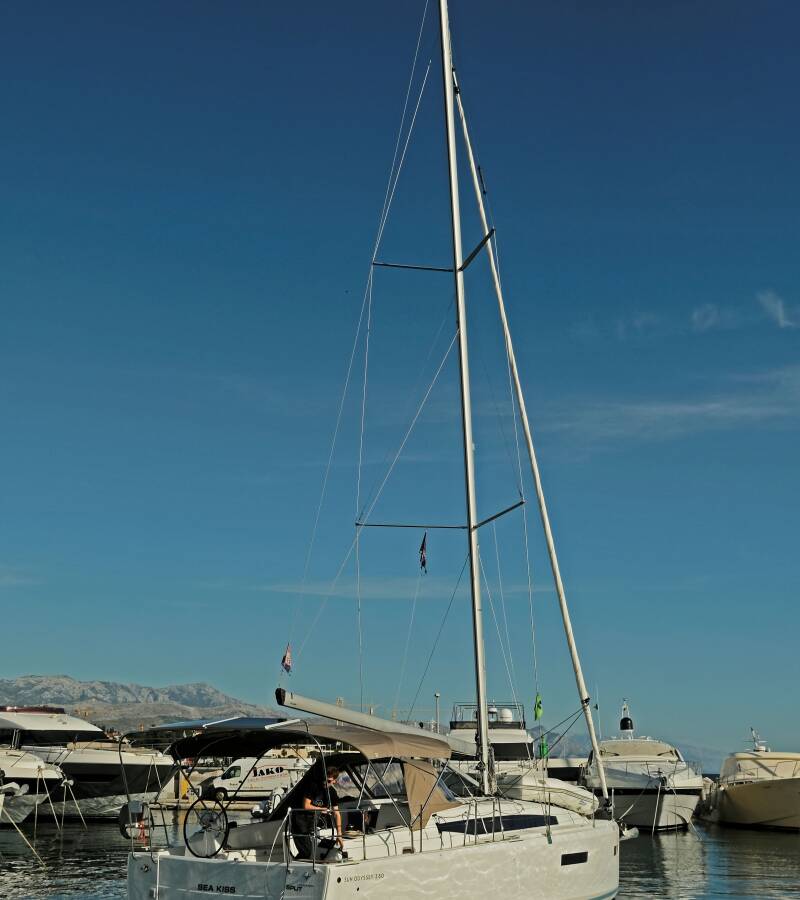 The Sun Odyssey 380 „Sea Kiss“ is equipped with a mainsail and a genoa as well as a Bimini top, Autopilot, Sprayhood, GPS chart plotter - cockpit.